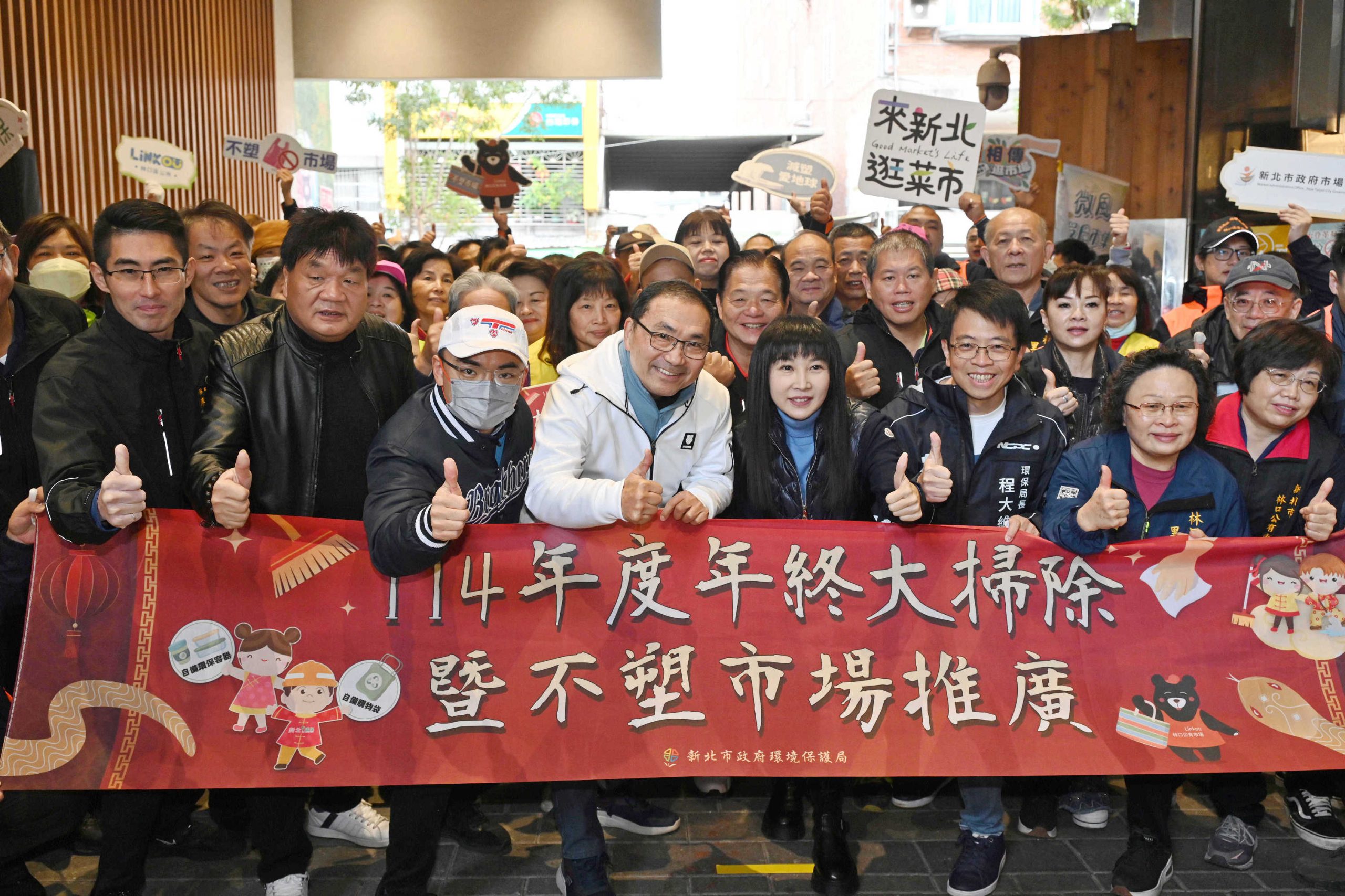 農曆春節將至,家家戶戶都會到市場採買年貨,新北市政府今(4)日舉行114年終大掃除暨不塑市場推廣活動,市長侯友宜赴林口公有市場推廣不塑市場,鼓勵市民朋友買菜自己「袋」,或使用市場的reBAG回收箱之二手袋,同時宣布今年起全市46座公有市場全面推動不主動提供塑膠袋,鼓勵自備購物袋的不塑消費模式,預計於年底達成「不塑市場」目標,用實際行動落實環保、守護環境。