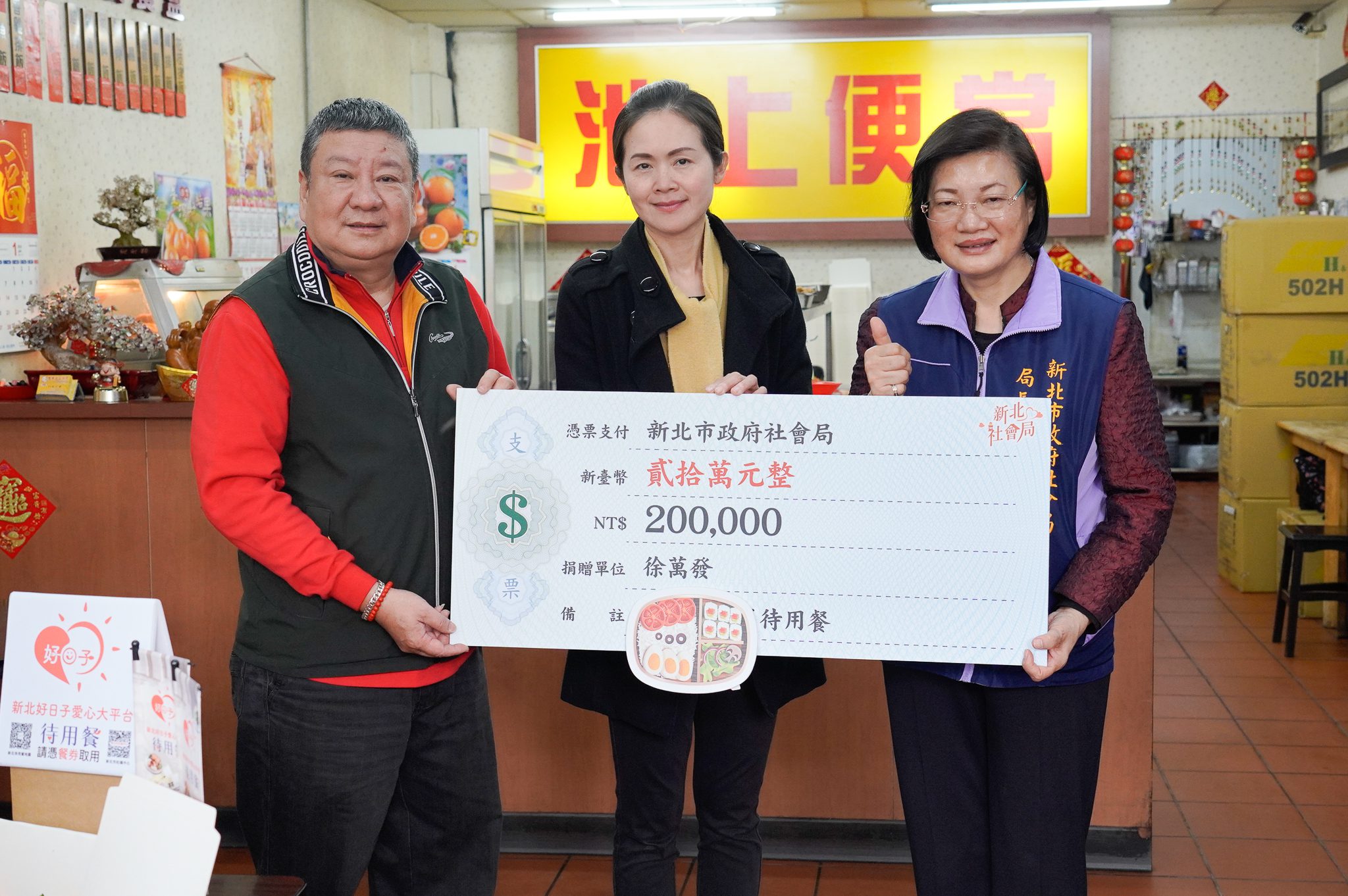 鑫邦企業公司董事長徐萬發透過新北市議員洪佳君的媒合,響應新北好日子愛心大平台待用餐計畫,捐贈新臺幣20萬元,預計發放2,000份待用餐給弱勢民眾,今(8)日下午在加入待用餐計畫的全福小吃店辦理捐贈活動,社會局長李美珍到場頒贈感謝牌,由市議員洪佳君代為受贈及轉交。