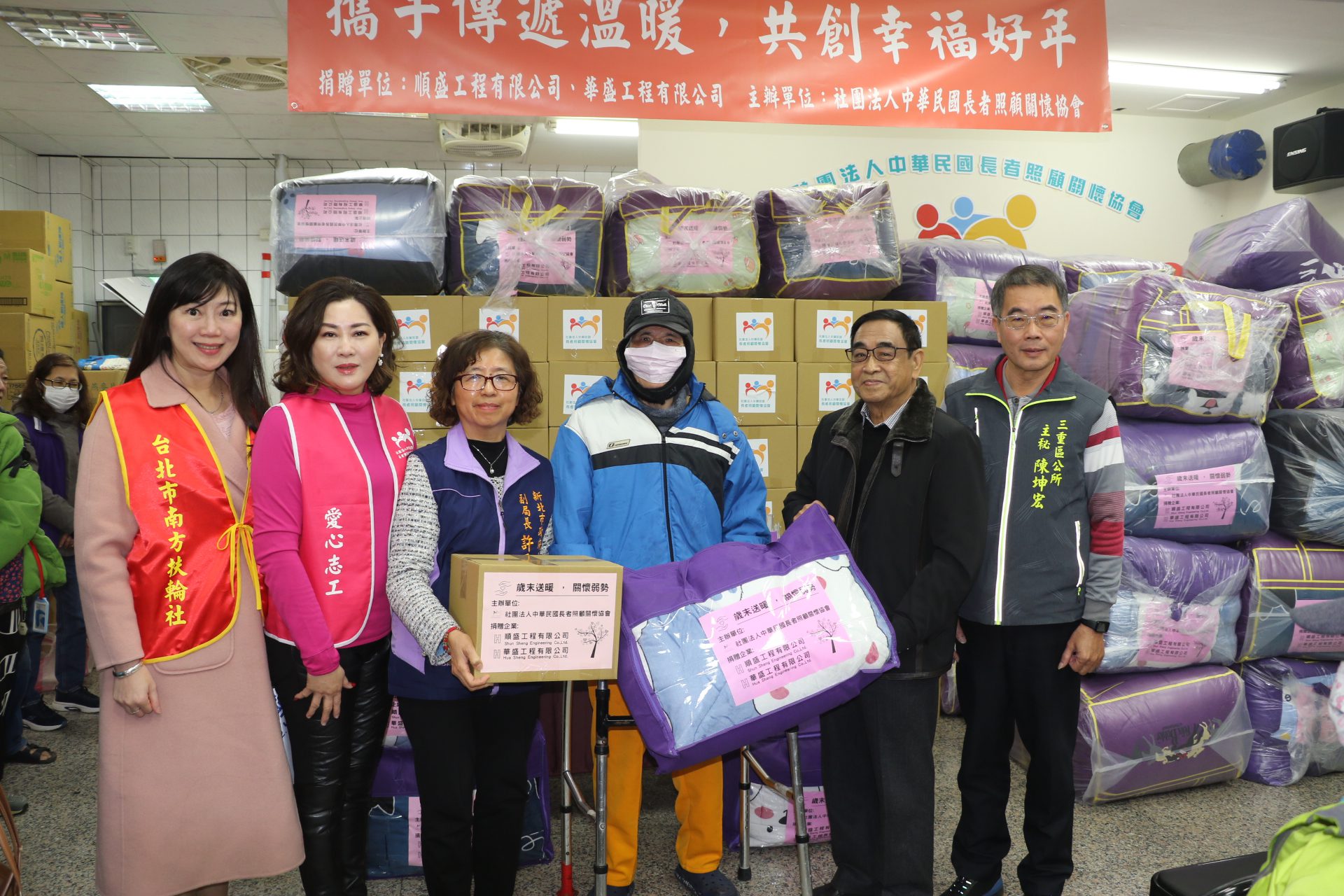 年關將近,順盛工程與華盛工程公司透過中華民國長者照顧關懷協會,響應新北巿好日子愛心大平台,於10日2度捐贈愛心物資箱250份、棉被200件給協會,以轉贈給三重、坪林及雙溪等弱勢家戶,公司董事長陳榮傑並和協會理事長周淑玲、南方扶輪社長周佳樺及社會局副局長許秀能等人,一起探視獨居長輩,關懷長輩在過年期間的生活。
