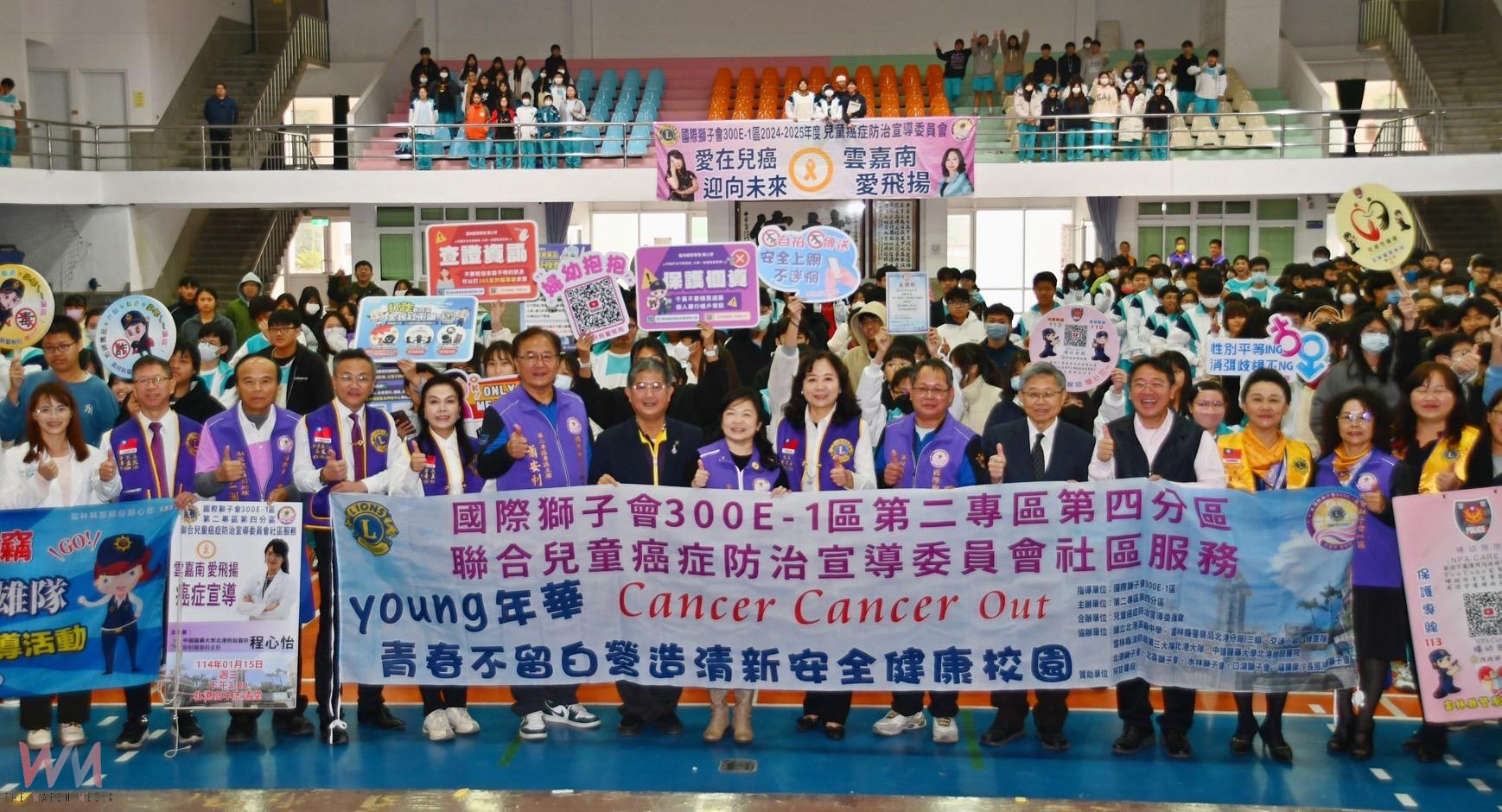 (觀傳媒雲林新聞)【記者洪佳伶/雲林報導】雲嘉南愛飛揚營造健康安全清新校園「young年華、青春不留白~營造清新、安全、健康校園 cancer cancer out!!」15日下午北港高中舉行。國際獅子會300E-1區第二專區第四分區主席蘇文亨獅友聯合兒童癌症防治宣導委員會主席吳雅雯獅友1月15日下午結合北港警分局、北港消防隊、北港媽祖醫院(中國醫藥大學北港附設醫院)、北港高中、北港獅子會、北英獅子會、水林獅子會、口湖獅子會、福爾摩沙長照芳療獅子會等單位,前進校園共同辦理宣導法治觀念及健康議題。