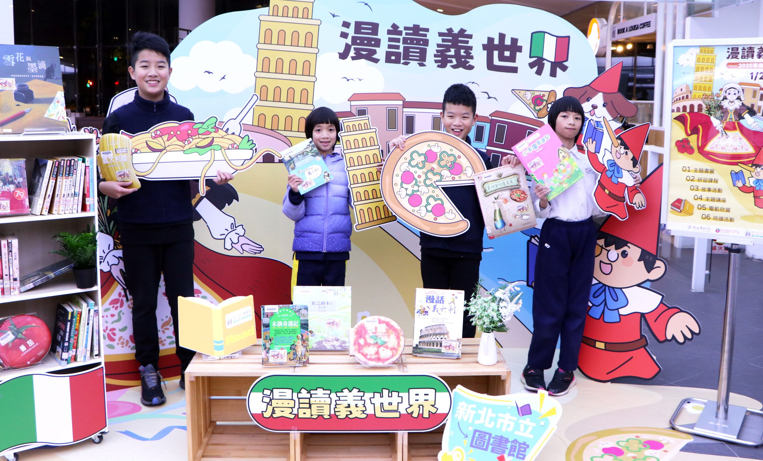 新北市立圖書館「漫讀義世界」寒假兒童閱讀活動,在總館及各分館規劃了一系列充滿「義」國風情的主題閱讀活動,總館《木偶奇遇記》繪本故事分享與小木偶木藝鉛筆,將帶小朋友跟著經典童話故事遊義大利;青少年圖書館「文藝復興與巨匠達文西手稿DIY」研習班,透過手作體驗感受達文西手稿中所描繪的機械設計;三峽分館「聽歌劇飲咖啡」邀大家一邊喝咖啡、一邊聽義大利歌劇;土城親子分館「Ciao,波隆納」插畫家貓魚將帶大家認識有「插畫界奧斯卡」之稱的「波隆納世界插畫大展;汐止分館「威尼斯嘉年華面具」創意工作坊則介紹世界三大嘉年華之一的「義大利威尼斯面具節」;另外還有萬里分館「義大利不倒的藝術—比薩斜塔積木」、永和親子圖書閱覽室「蒙娜麗莎的微笑」印象數字油畫、以及平溪分館「愛的滋味—義式料理」等各種介紹義大利的人文風情及藝術、美食、歷史相關的閱讀活動。
