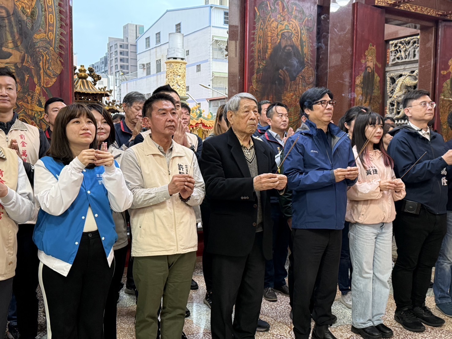 許智傑表示年節將近,各地準備過新年的氛圍越來越濃厚,之前前往的三鳳中街、高雄果菜市場、左營年貨大街等等,都可以感受到辦年貨以及過年的愉悅和熱鬧感!今天我也和市長一起走進市場與廟宇跟所有市民好友拜年問好,今天更是特別駐足一下,向關聖帝君、清水祖師、三山國王祈求新的一年繼續庇佑高雄、保佑臺灣。