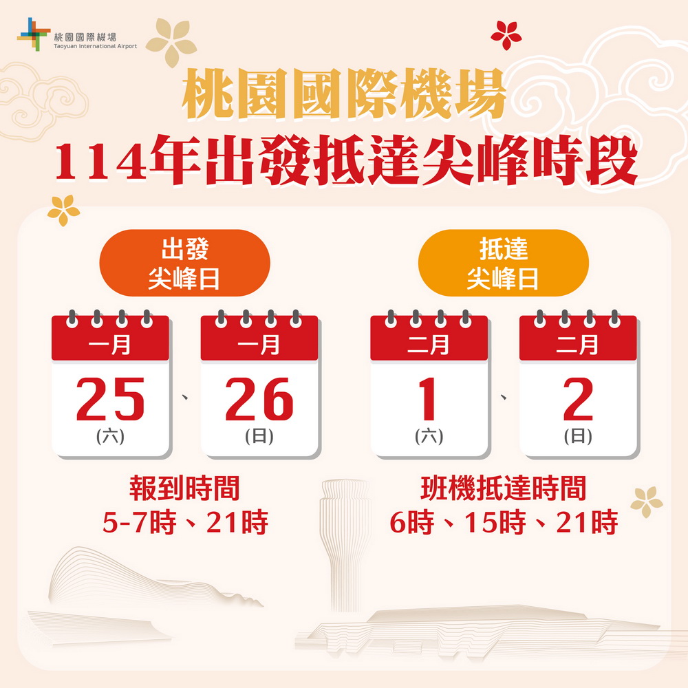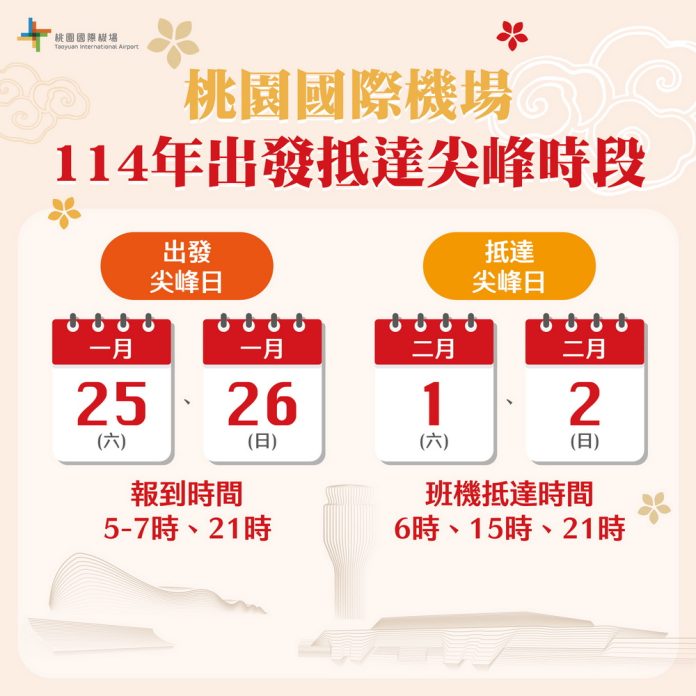 機場公司表示,春節疏運期間出境尖峰日會在1月25日與26日,入境尖峰日會出現在2月1日與2日。為順利紓解人潮,春節疏運期間每日5時起,航警局所屬之行李安檢線與移民署所屬之自動查驗通關系統(e-Gate)都會滿開,全線投入為旅客提供最佳服務。桃園機場出入境所有e-Gate均具閘道內註冊及通關二合一功能,申請使用年齡調降至10歲,且身高下修為120公分,無戶籍國民持中華民國有效晶片護照,免事先申請入國許可亦得使用。