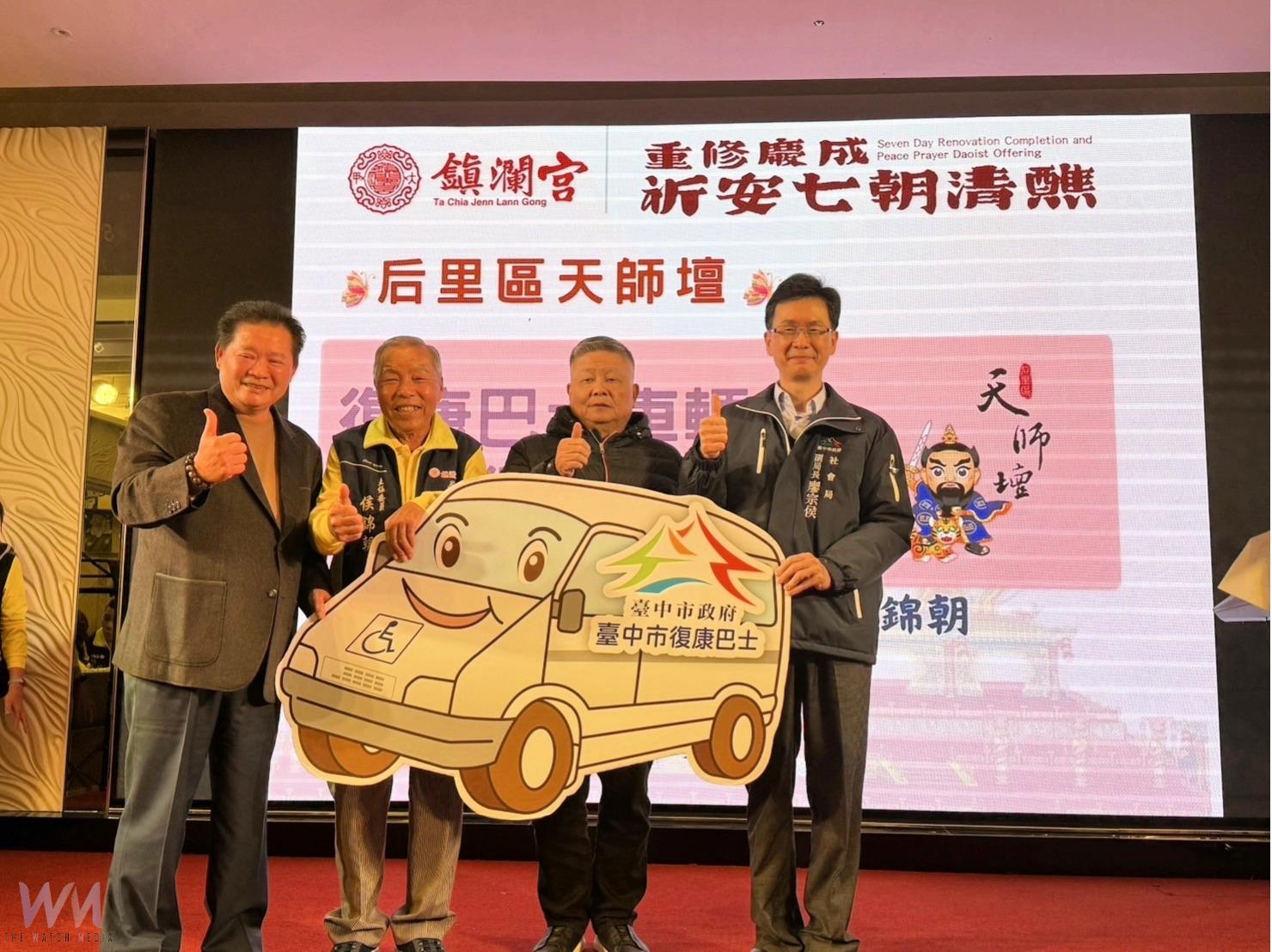 廖副局長說,台中復康巴士為六都唯一免費,希望部分經濟弱勢的身障朋友「無障礙」使用交通工具,也讓身心障礙朋友能夠走出家門,參加各項活動;他感謝大甲鎮瀾宮后里天師壇秉持媽祖保佑濟世眾生的慈悲情懷,與市府攜手打造美好有愛的溫暖城市,方便身心障礙朋友就醫、交通接送和社會參與。