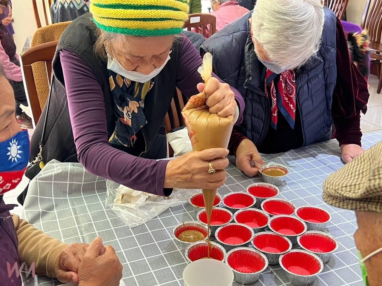 長輩們在老師的指導下親手操作,從過篩麵粉到攪拌粉漿,再到裝模準備蒸煮,過程中氣氛熱烈而歡樂。他們紛紛表示,不僅學到了製作發糕的技巧,也對傳統文化有了更深的認識。「這竹籤畫十字真的很特別!」一位長輩笑著說,發糕蒸得漂亮,全靠這個小技巧。