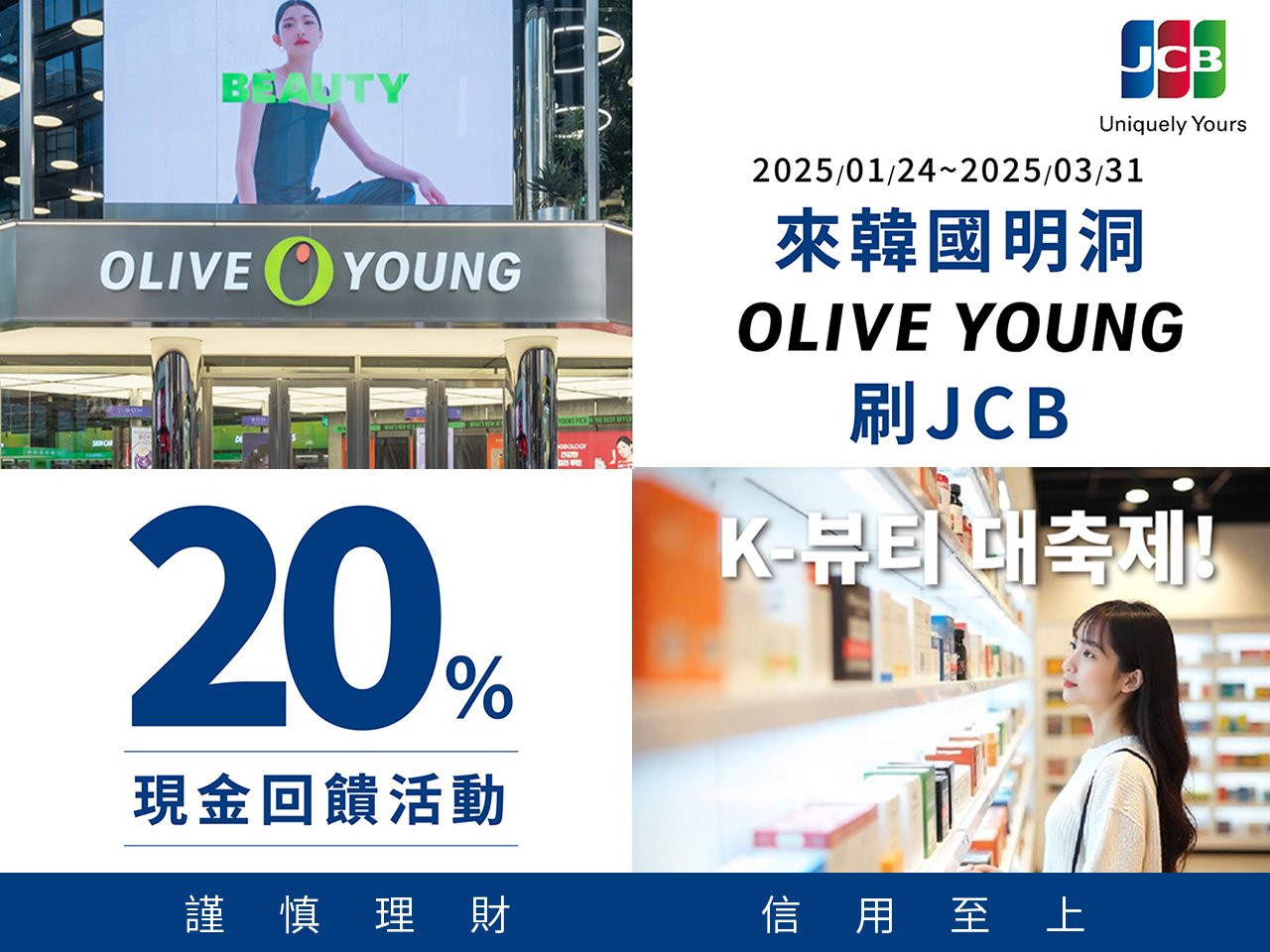 *不適用銀行與詳情請以本活動官網為準:https://www.specialoffers.jcb/zh-tw/campaign/detail/oliveyoung2025/83043/?tk_id=sp_kkdis_pr&utm_source=news&utm_medium=PAID&utm_campaign=oliveyoung&utm_content=