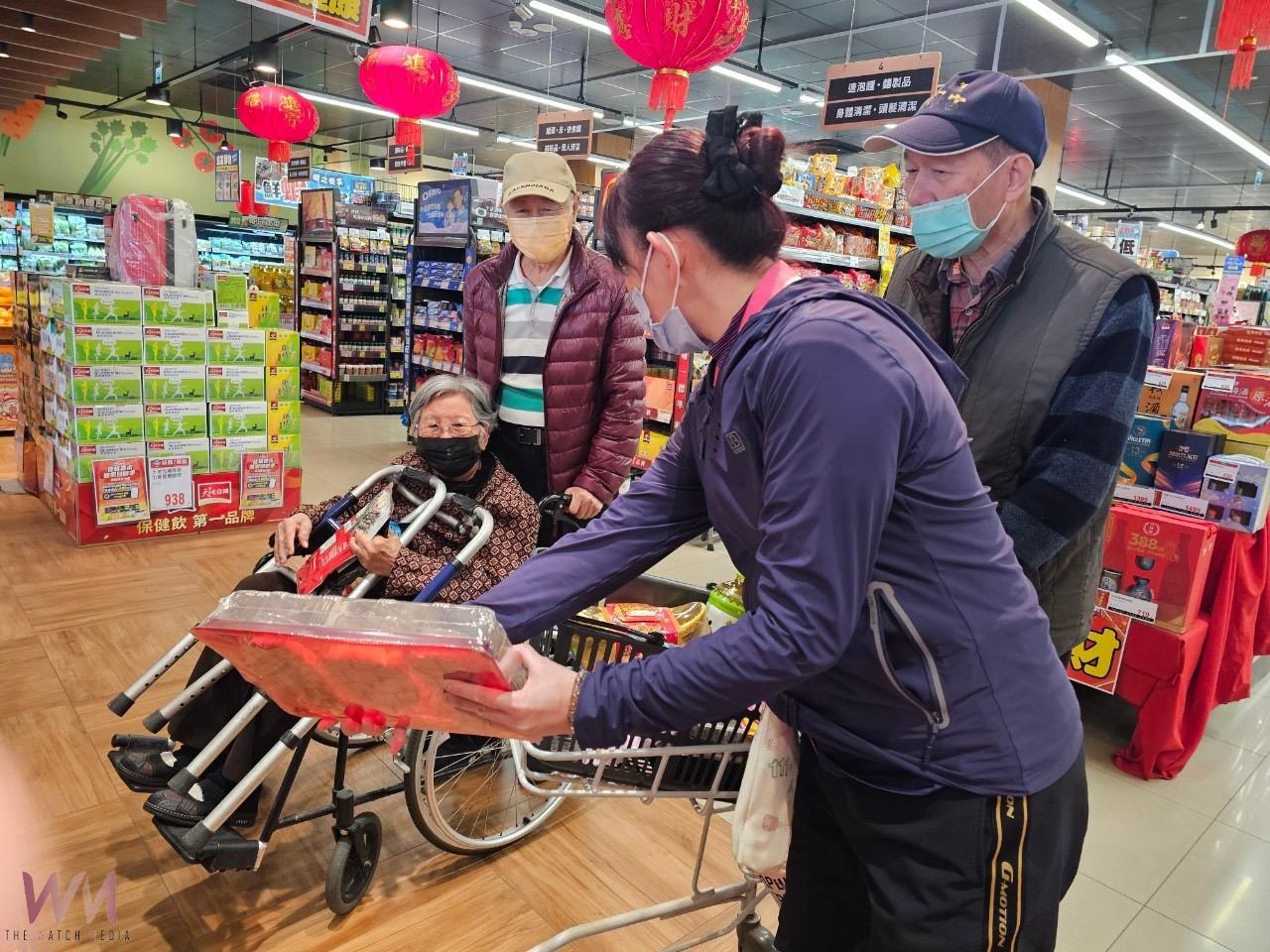 今(23)日,工作人員貼心地化身採買小幫手,協助長輩們推著購物車,穿梭於貨架間挑選心儀的年貨。零食、飲料等商品琳瑯滿目,長輩們仔細挑選,臉上洋溢著滿足的笑容。83歲的王伯伯笑著說:「這感覺像是回到年輕時候,過年準備東西的那份期待又湧上心頭。」