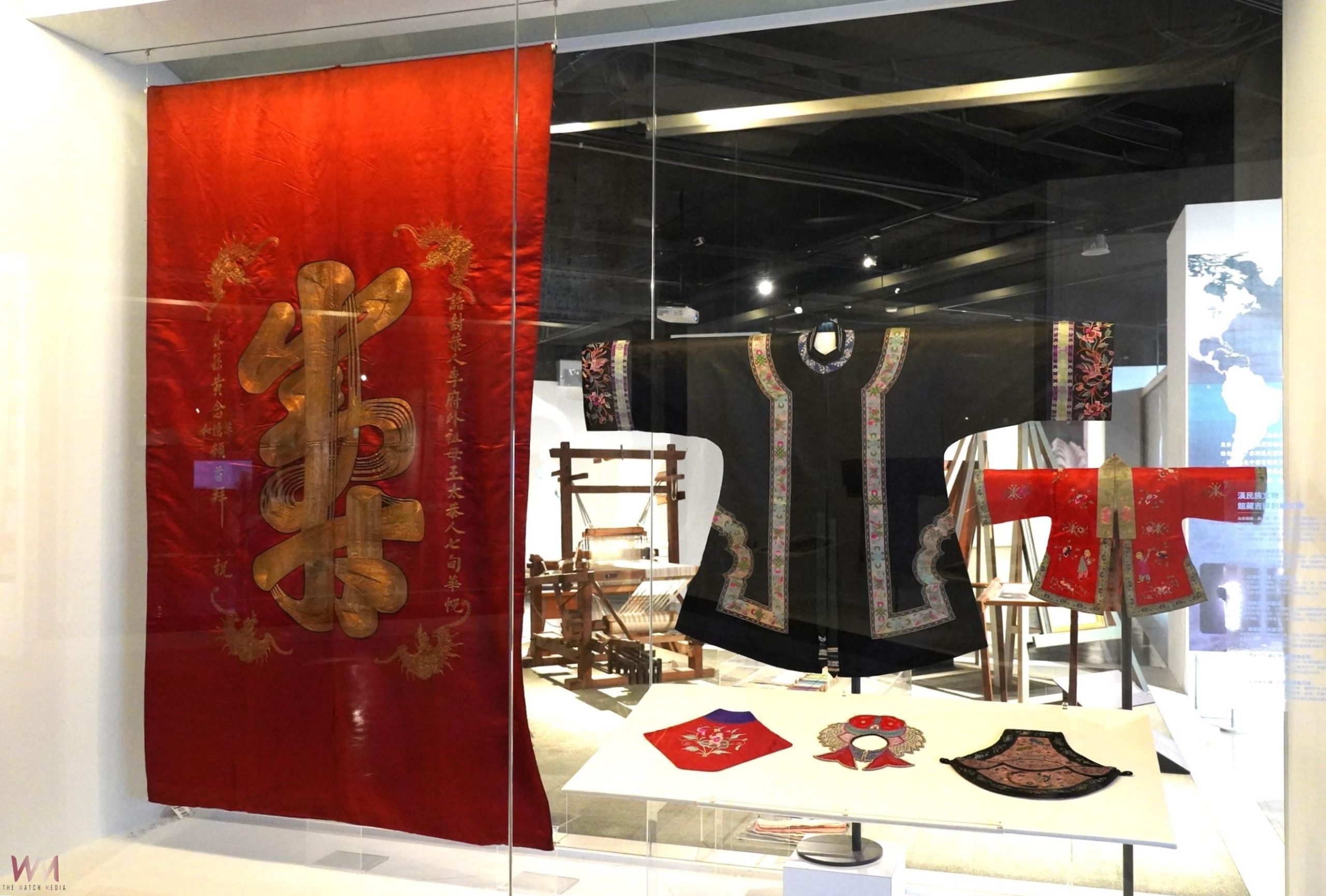 此外,配合新年到來,纖博館二樓常設展廳也推出館藏漢族祈福呈祥文物微型展。纖博館說明,傳統過年期間家家戶戶祭拜神明及祖先,都會在神明廳供桌前方繫上一塊繡有祈福納祥文字或圖案的方形桌圍,小孩子穿上吉祥話語的童裝保平安,大人也要穿上紅色或喜氣的服裝,象徵新的一年平安富貴。因此在許多傳統服飾或傢飾上可以看到福、祿、壽、喜、子、財等字樣,或繡上吉祥圖像表達祝福和願望。