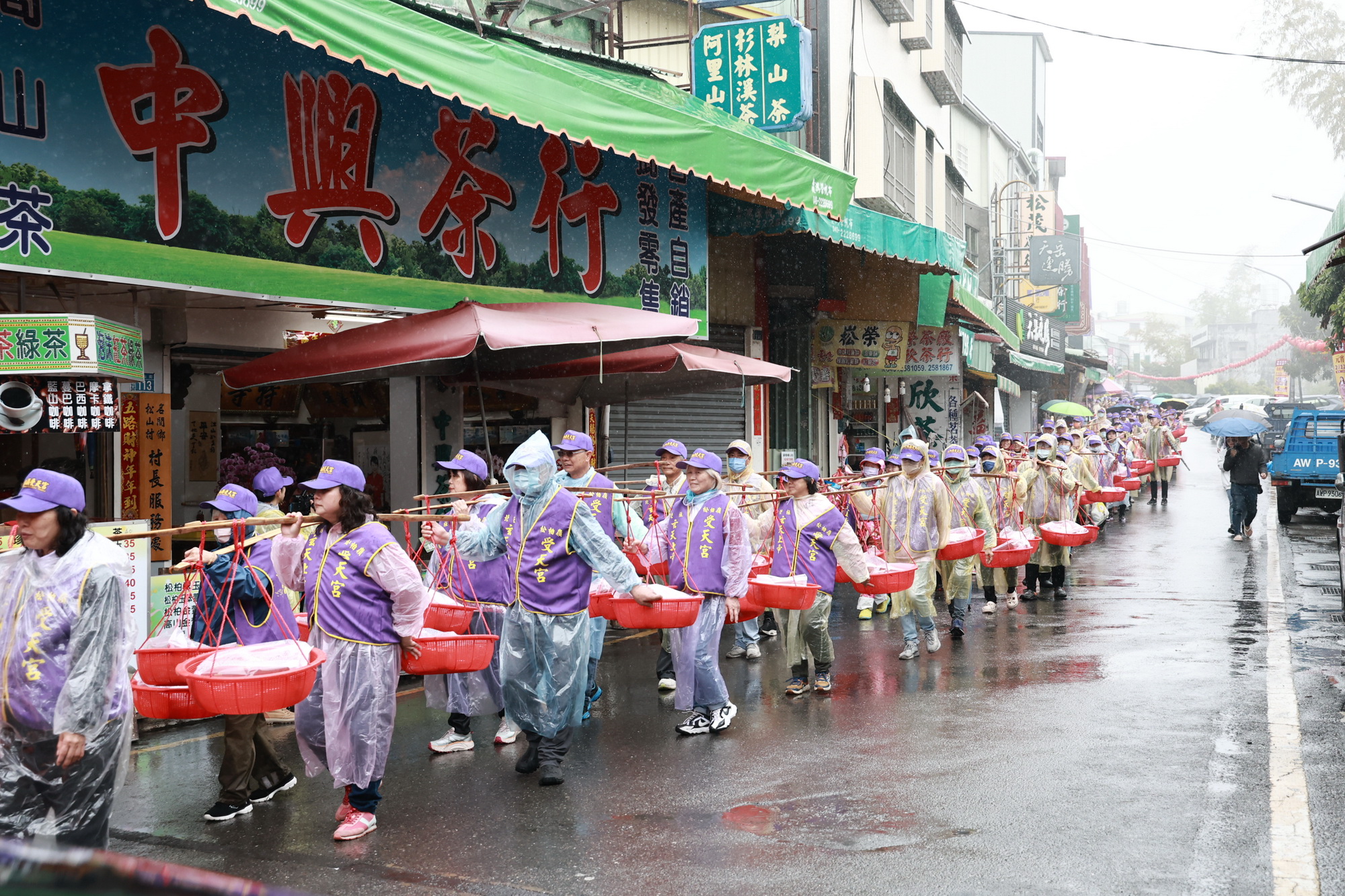 擔桃儀式在舞獅隊與康、趙元帥帶領下,冒雨從第一停車場行走至廟埕,並於廟埕進行米糕桃的揭桃儀式及全體團拜與獻禮,受天宮主委陳登岳偕同許縣長、縣議員張婉慈、林儒暘、林憶如、張秀枝、吳棋楠、名間鄉長陳翰立、南投市長張嘉哲、名間鄉代表會主席吳金樹及村里長等多位貴賓們一起持香祝禱,並分送米糕桃給現場信眾吃平安。