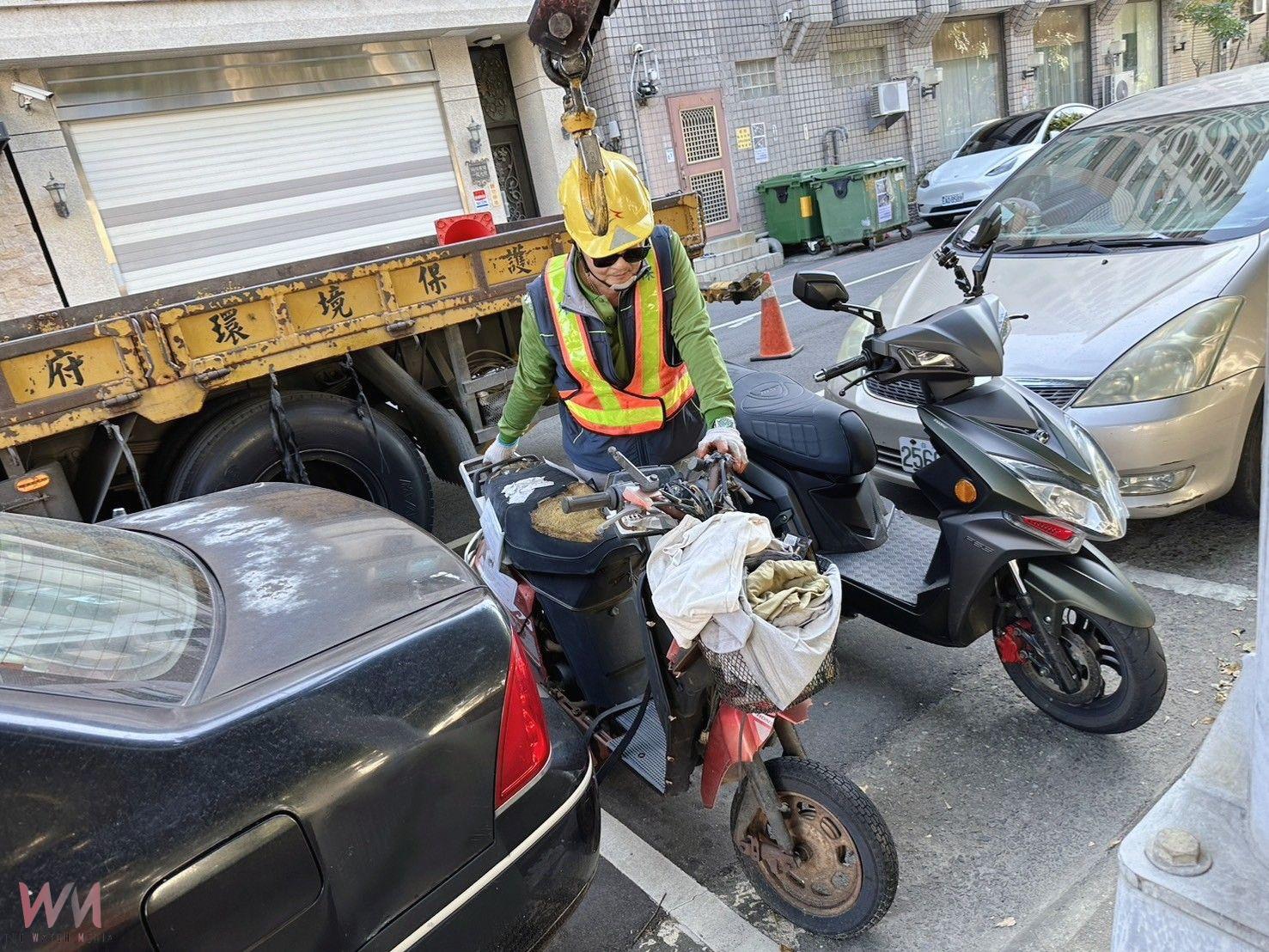 占用道路無牌廢機車拖吊作業。(圖/台中市環保局提供)