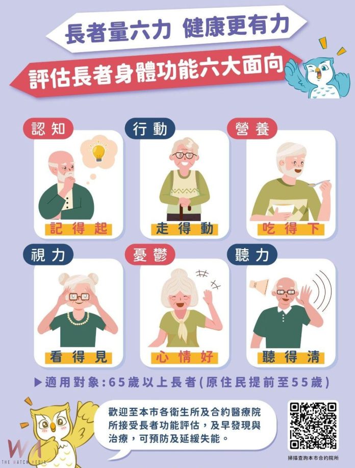衛生局長曾梓展說明,衛生福利部國民健康署依據世界衛生組織(WHO)於2019年公布新版長者整合性照護評估指引(Integrated care for older people,ICOPE),針對長者六大功能,包含:認知、行動、營養、視力、聽力及憂鬱提出評估工具與照護路徑,幫助長者早期發現功能衰退的徵兆,及早進行各面向介入,延緩及降低失能風險。