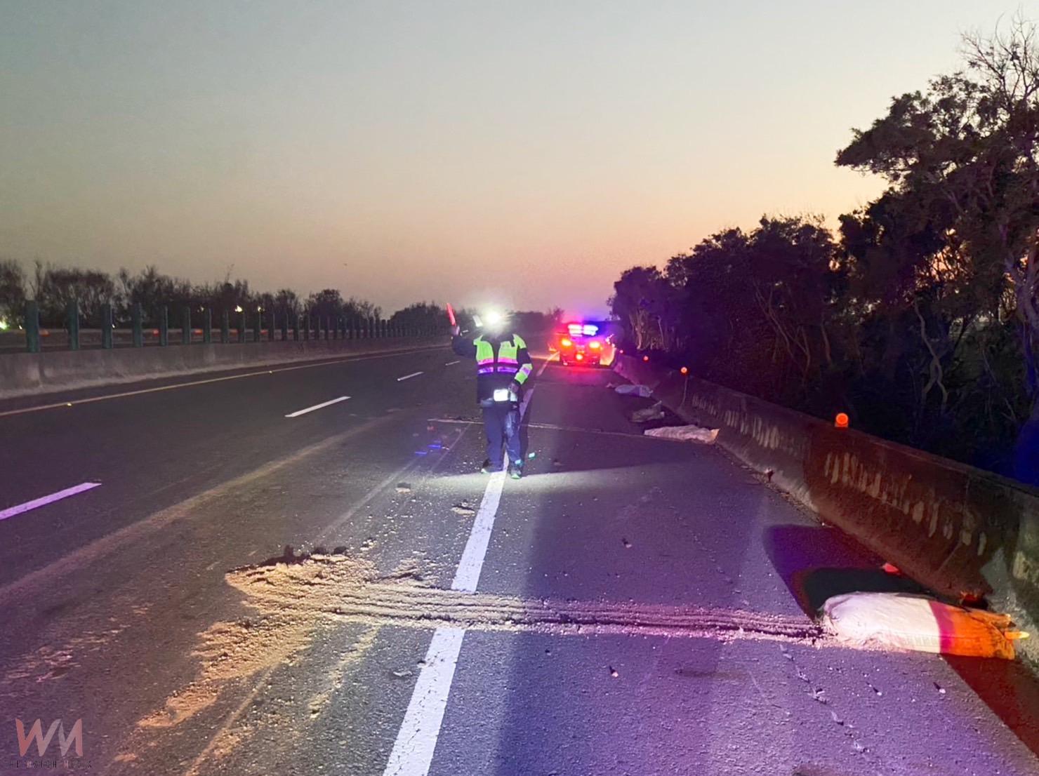 (觀傳媒雲林新聞)【記者洪佳伶/雲林報導】2月16日17時18分許,一輛貨車行經臺61線快速道路南下240至247公里處,沿路掉落多包裝有紅土的袋子,造成部分路段車輛回堵。北港警分局勤務指揮中心接獲報案後,立即通報口湖聯合所巡邏員警到場處理,確保道路安全與交通順暢。