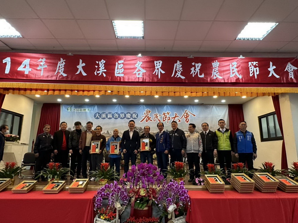 (觀傳媒桃竹苗新聞)【記者曾平/桃園報導】桃園市大溪地區慶祝114年度農民節大會,今(18)日舉行,副市長蘇俊賓出席時表示,祝賀農友農民節快樂,今日受獎3位傑出資深農民莊宏順、陳浴集、周朝雄獎牌,他們年紀已經70、80歲,從事農業更超過40、50年,感謝他們對於農業的重要貢獻,同時更擔任了傳承的重任,另外還有9位專業農民也是各懷絕技,包含有苦茶、綠竹筍、短期葉菜、稻米、花卉等領域的專業農民,對於大溪的農業貢獻良多。