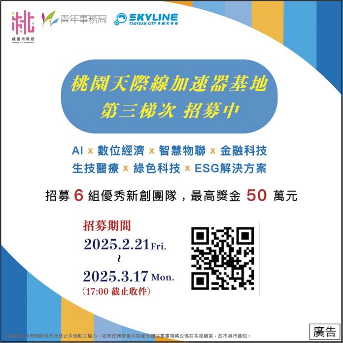 (觀傳媒桃竹苗新聞)【記者曾平/桃園報導】桃園市青年事務局於今(21)日啟動「桃園天際線加速器基地」第三期招募,邀請對AI、數位經濟、智慧物聯、金融科技、生技醫療、綠色科技及ESG解決方案等關鍵產業的新創團隊進駐,基地將協助新創團隊快速成長,鏈結國內外市場資源。更多資訊及申請詳情,請查詢桃園市青年事務局官網:https://youth.tycg.gov.tw/。