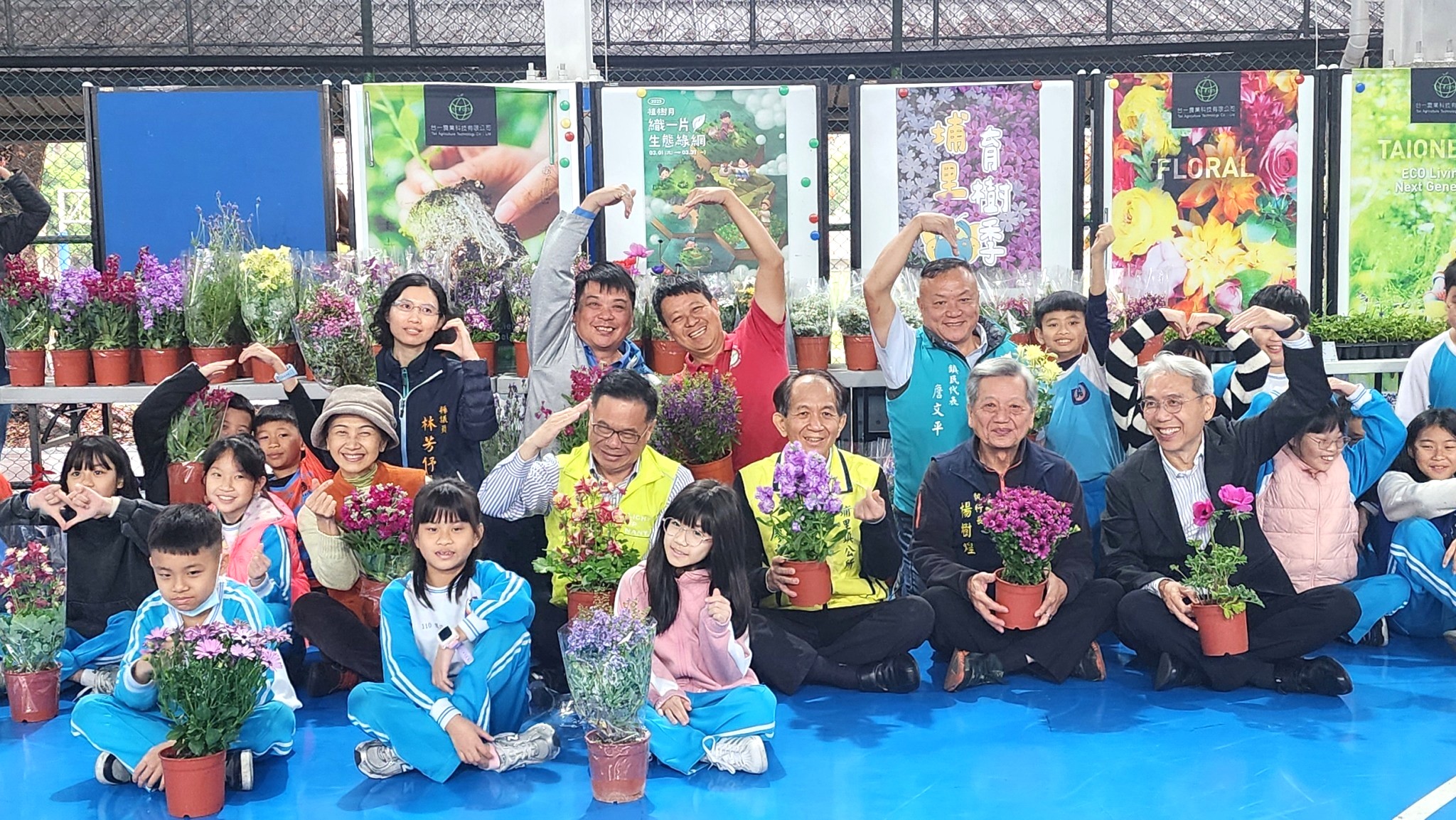 ▲廖鎮長及貴賓一一分發蜜源花苗給學生種植。(記者石振賢攝)