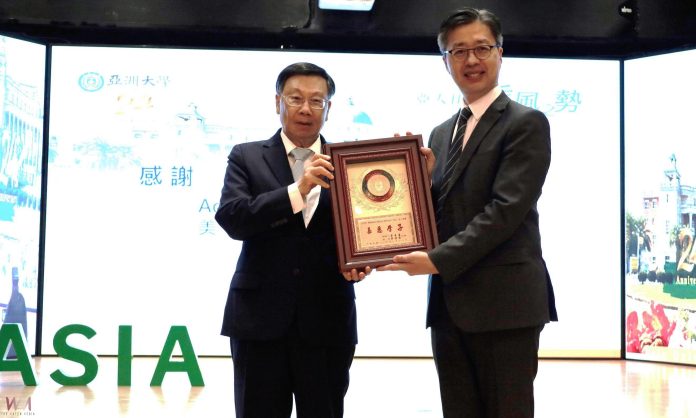 亞大校長蔡進發(左),在亞大24周年校慶頒發感謝狀,感謝美商超微半導體AMD公司提供運算資源,由AMD資深業務協理黃偉喬(右)代表接受。(圖/記者廖妙茜翻攝)