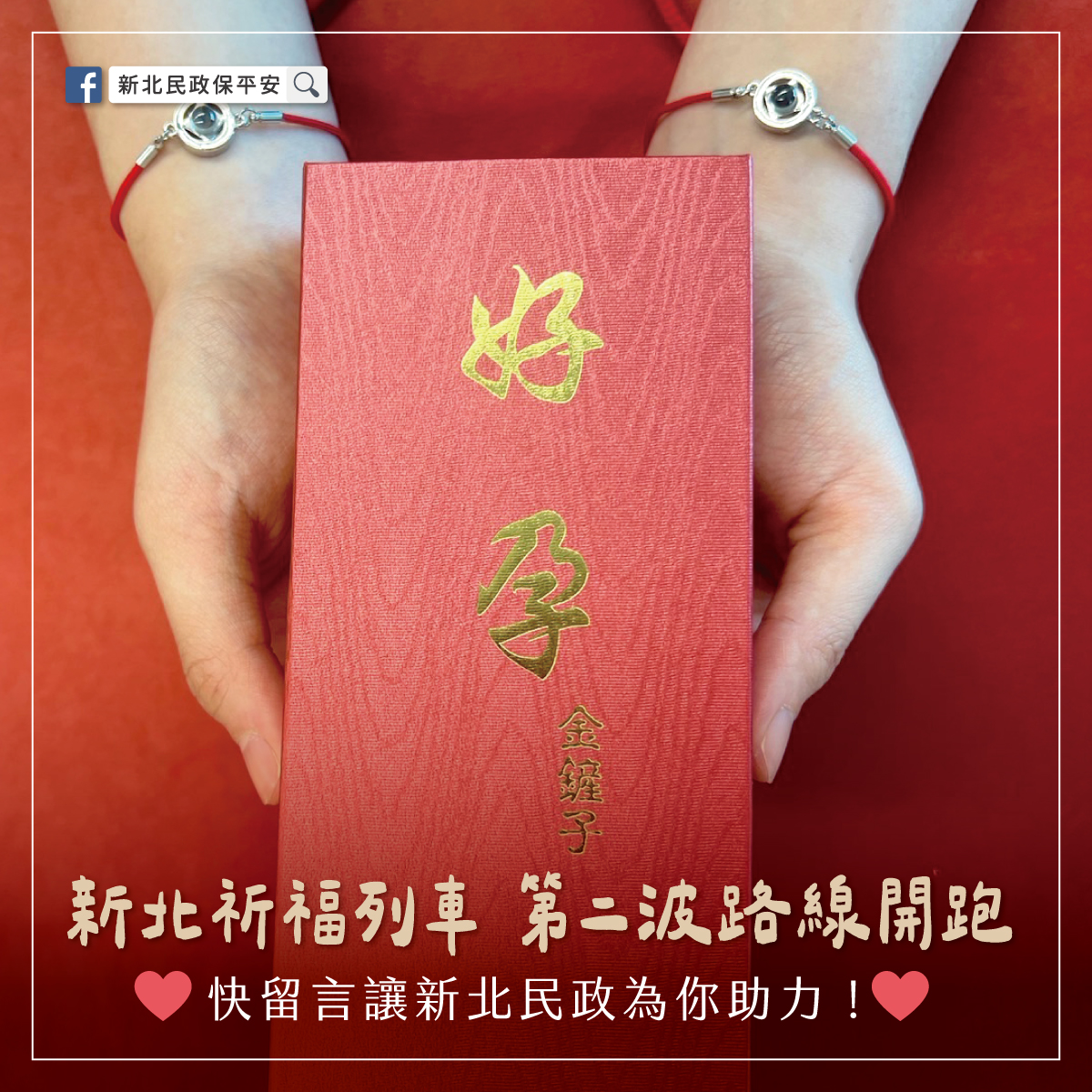 民政局補充,新北祈福列車活動將持續至6月30日,民眾可透過打卡集章兌換限量「祈福列車」文創商品。現在至民政局臉書「新北民政保平安」完成指定任務,還有機會獲得限量紅線及金鏟子,歡迎民眾把握機會,為愛情、家庭祈得圓滿祝福!