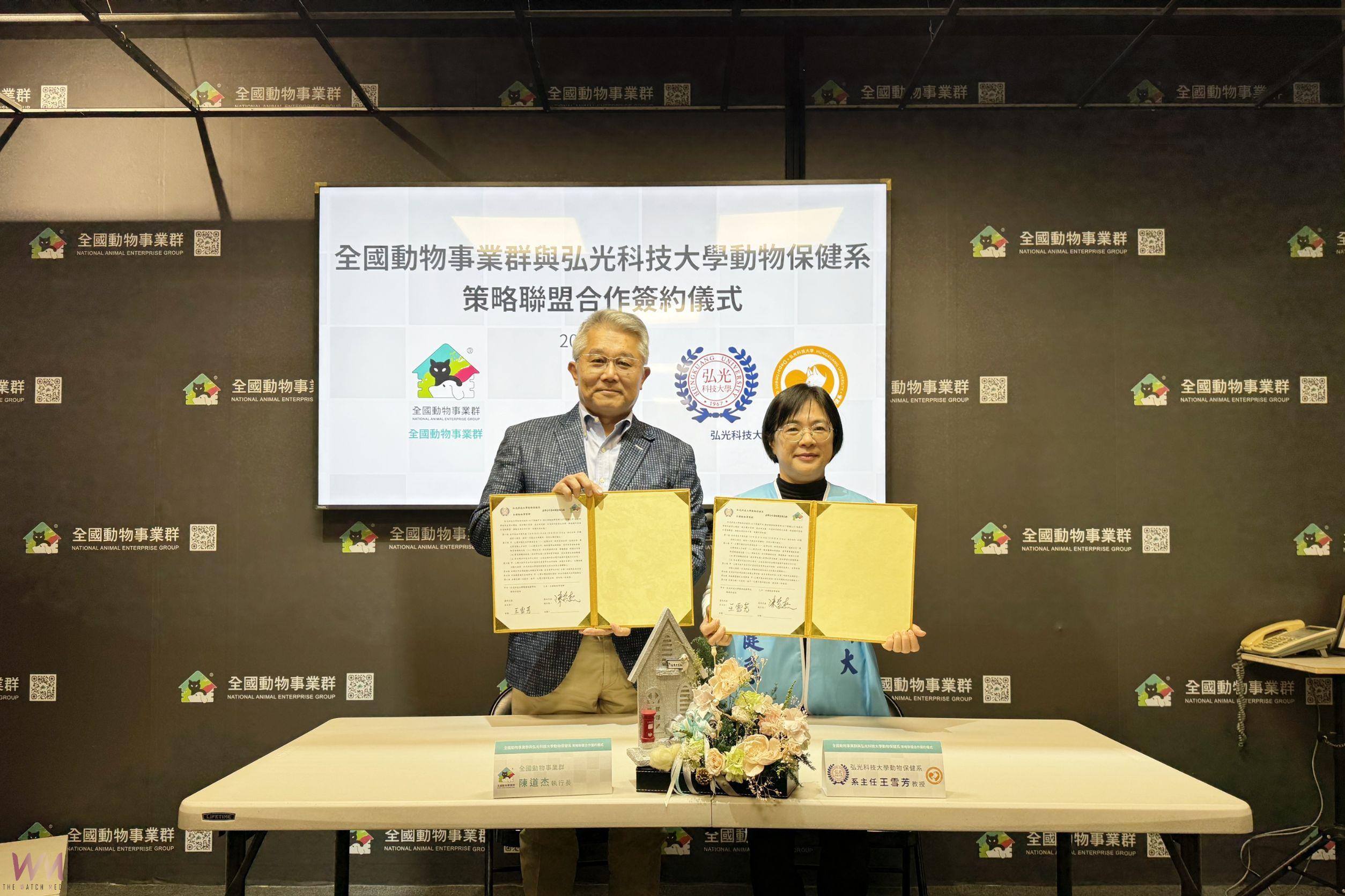 (觀傳媒中彰投新聞)【記者廖妙茜/台中報導】弘光科技大學動物保健系與全國動物事業群合作意向書簽約儀式,於今(14)日在全國動物事業群總部舉辦。由全國動物事業群執行長陳道杰、弘光科技大學動物保健系系主任王雪芳代表雙方簽署合作備忘錄(MOU),雙方將持續在產學合作、教育合作、學術交流、實習與職涯發展四大方向合作,共同開創寵物產業與大學教育的新局面。