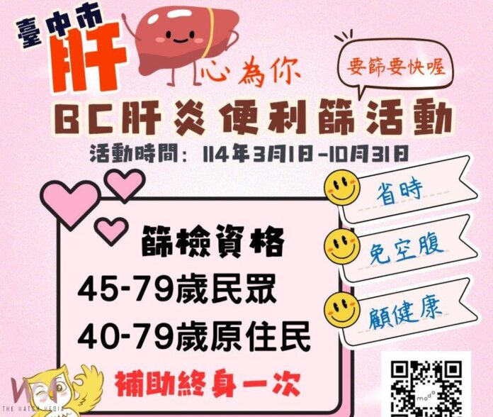 (觀傳媒中彰投新聞)【記者廖妙茜/台中報導】台中市政府衛生局攜手193家醫療院所,3月1日起至10月31日推出「BC型肝炎便利篩」活動。衛生局表示,此次活動針對符合政府補助終身1次尚未接受BC型肝炎篩檢的45-79歲(原住民40-79歲)市民,提供便利的篩檢服務,優化門診縮短抽血等待時間,讓市民接受BC肝篩檢更便捷,盼及早發現、及早治療,顧肝免煩惱。