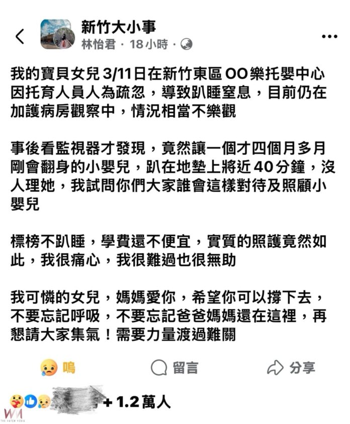 家長指出,家中四個月大女嬰、疑因托育人員人為疏忽,導致趴睡窒息,現仍在加護病房觀察中,情況相當不樂觀,事後看監視器才發現,該中心竟然讓四個月多月剛會翻身的嬰兒,趴在地墊上將近四十分鐘,沒人理會。家長也痛批、該托嬰中心標榜不趴睡,學費還不便宜,實質的照護竟然如此,她很痛心,很難過也很無助,希望女嬰能撐下去,不要忘記呼吸,也請大家幫忙集氣,需要力量渡過難關。