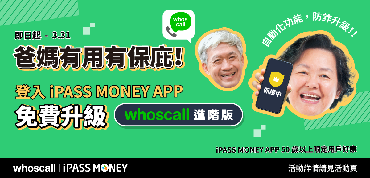 根據警政署刑事警察局統計,2024 年上半年「假冒公務機關詐騙案」的被害人中,超過 65% 為 50 歲以上族群,顯示樂齡族群易成為詐騙集團鎖定目標的高風險對象。為了提升樂齡族群對詐騙的警覺性及防詐知識的掌握度,一卡通與 Whoscall 合作,在 2025 年 3 月 20 日至 3 月 31 日期間,年滿 50 歲的用戶只需登入 iPASS MONEY APP,即可符合半年份《Whoscall 進階版》贈送資格,一卡通公司將於活動結束後透過簡訊發送免費進階版序號,助樂齡族群全面提升通訊安全,有效降低詐騙風險。