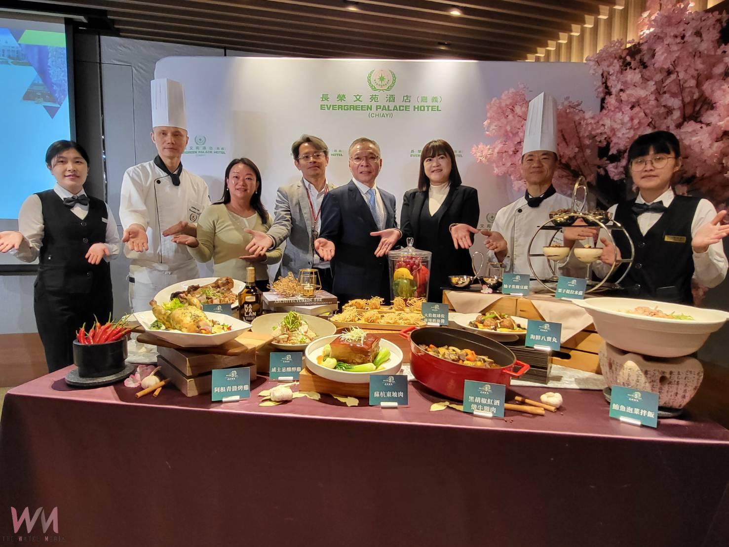 長榮文苑酒店(嘉義)歡慶五週年慶推出時尚饗宴美食節、住房優惠、抽獎、公益展活動,總經理蘇筱斐、嘉義縣文化觀光局局長徐佩玲、故宮南院處長彭子程、安仁家園院長謝孟潔等貴賓出席者記者會,邀請全國旅客來嘉義旅遊。