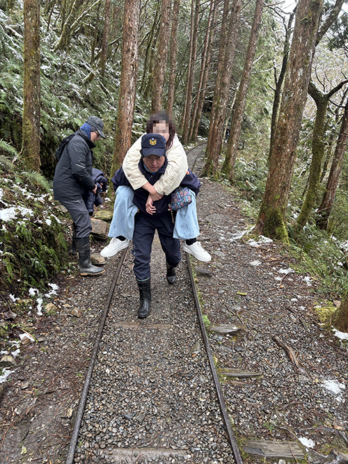 (觀傳媒宜蘭新聞)【記者陳俊傑/宜蘭報導】一名香港籍曾姓遊客(30餘歲)日前參加旅行團至太平山森林遊樂區見晴步道健行,因當時受寒流影響山區下雪步道濕滑,行經1號吊橋時不慎滑倒,導致左腳踝扭傷無法行走,同行遊客見狀至步道路口請求協助。三星警分局太平山派出所員警執行巡邏勤務行經該處,立即下車協助,並揹負護送上救護車送醫。