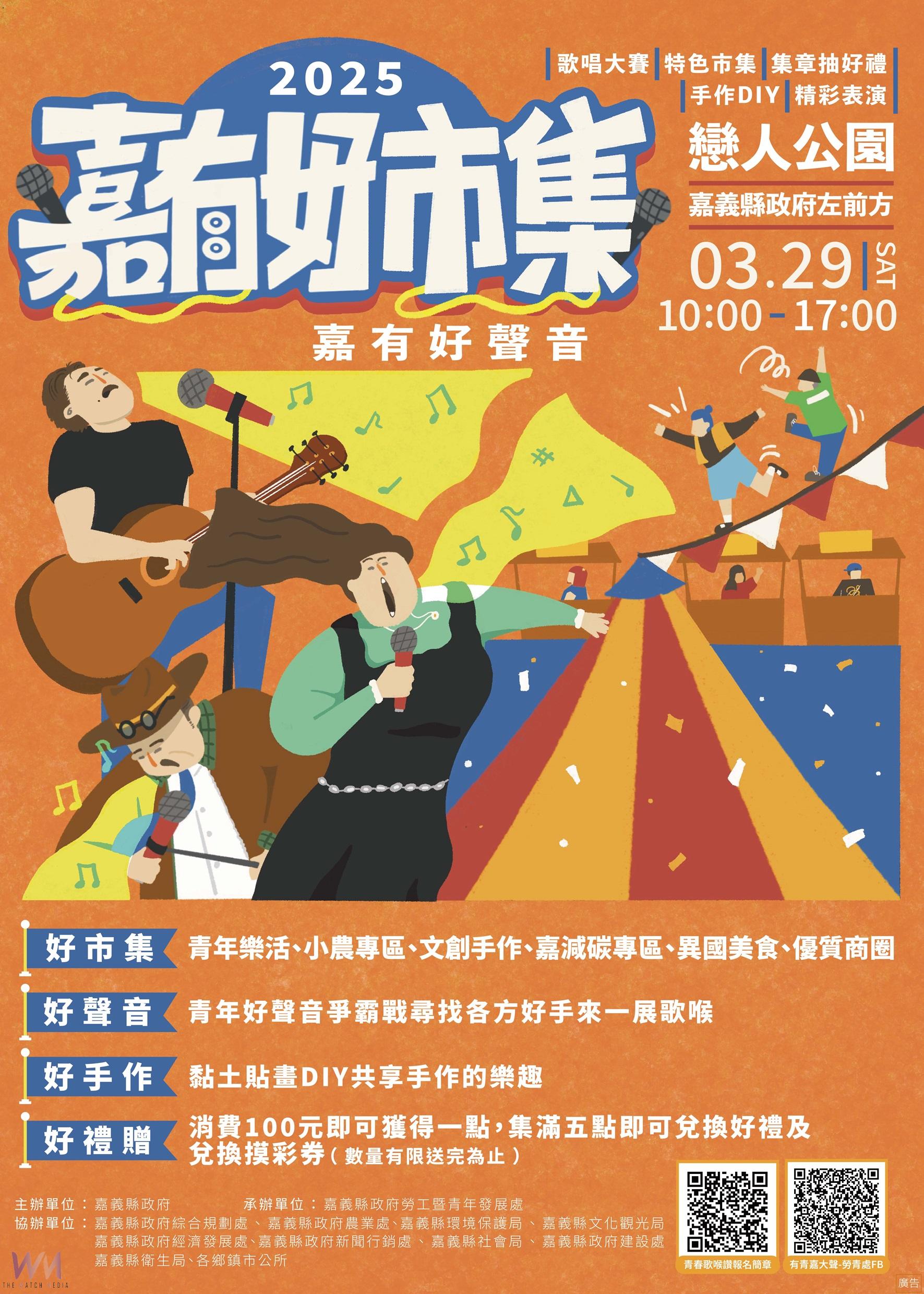 (觀傳媒嘉義新聞)【記者吳東林/嘉縣報導】「嘉有好市集」3月 29日(星期六)將在嘉義縣治特區戀人公園再度登場,除了有超過150個特色攤位,縣府還結合青年節辦理歌唱大賽,讓青年朋友有展現歌喉的機會。