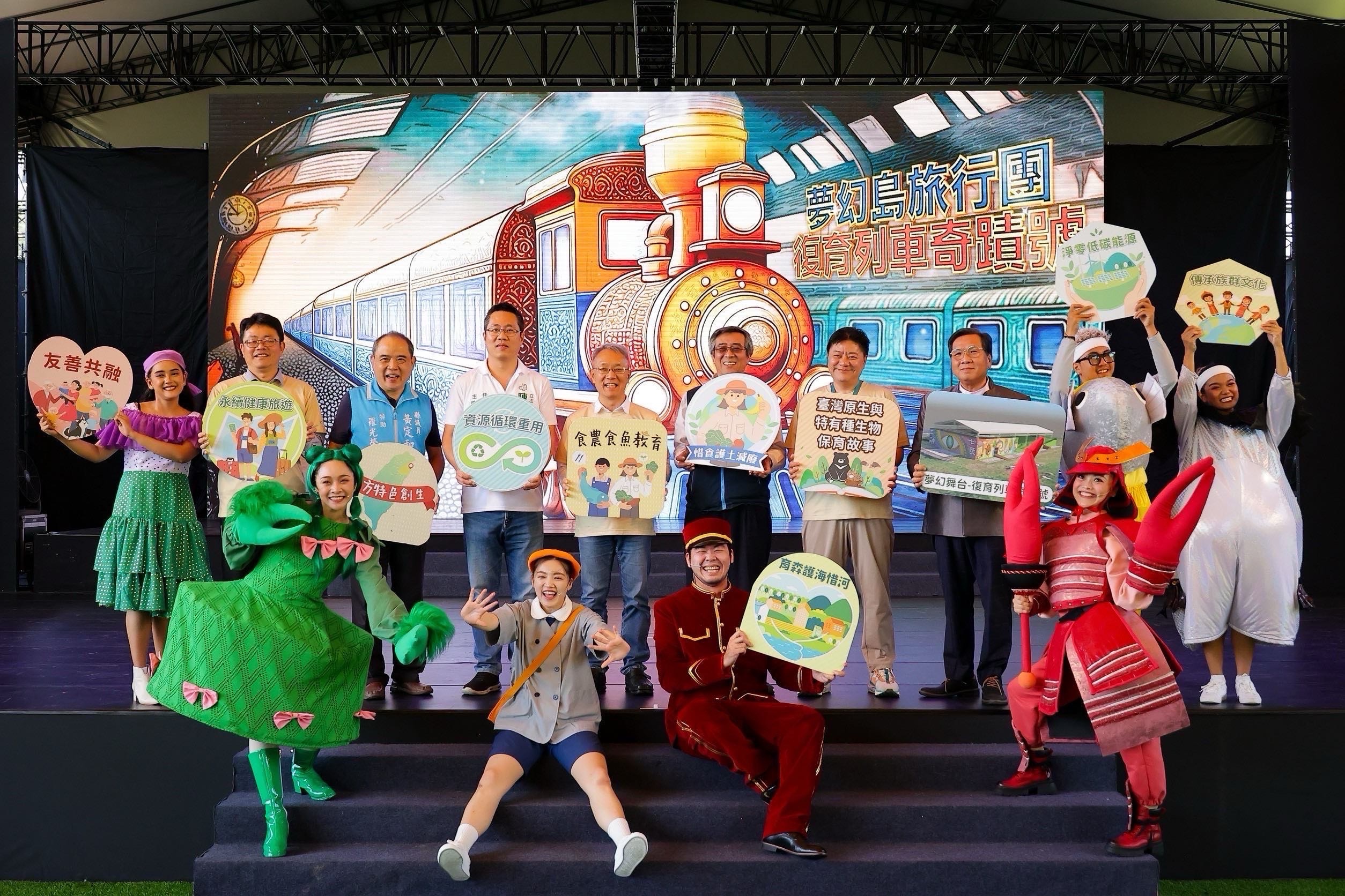 林茂盛代理縣長表示,由當代樂坊李建興老師及徐灏翔總導演所帶領的表演藝術團隊,透過全新的音樂舞蹈創作,將綠博年度定目劇《夢幻島旅行團-復育列車奇蹟號》所蘊含的生物多樣性保育及關懷表現的非常生動精采,淋漓盡致。今年綠博除了將三種生物故事融入定目劇之外,在園區入口大門也透過非常具有特色的園藝綠雕,將十種台灣原生與特有種生物以可愛的模樣呈現,吸引大家關注與愛護。這十種生物包括:「宜蘭水蓑衣、宜蘭天南星、五色鳥、台灣野山羊(長鬃山羊)、青鱂魚、青毛蟹、黃腹細蟌、山椒魚與棲蘭姬春蟬」,每種生物的生存境遇,未來大家可以在綠博生物綠雕城牆兩側的大繪本中閱讀到他們的故事。
