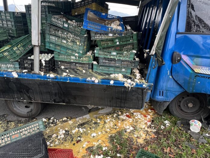 (觀傳媒宜蘭新聞)【記者陳俊傑/宜蘭報導】宜蘭縣三星鄉三星路三段附近7日下午15時左右發生一起載滿雞蛋的小貨車自撞路樹的交通事故。現場雞蛋碎滿地,警方獲報前往處理,肇事原因尚待釐清。