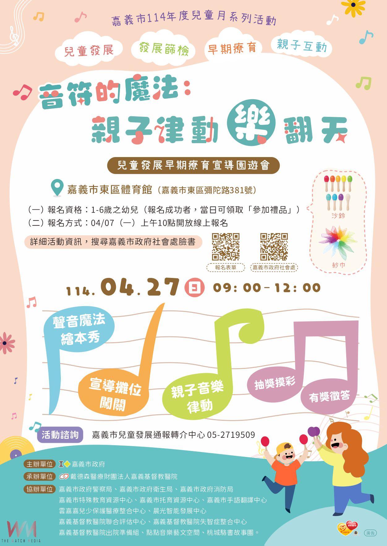嘉基指出,年度活動將由『音符的魔法:親子律動『樂』翻天』兒童發展園遊會展開序幕!4月27日(星期日)邀請親子一同挑戰大手牽小手親子活動,有音樂與繪本結合的親子律動,豐富了親子互動的品質;闖關攤位特別為兒童及家庭廣納相關兒童常用之資源單位,讓孩子與家長在輕鬆愉快的氛圍中體驗寓教於樂的學習之旅。即日起接受,名額280組(1-6歲兒童親子律動活動),滿額為止,報名親子律動親子組,同時可獲得精緻的參加禮品。另外,參與闖關活動者(無年齡的限制),完成闖關活動最後還有摸彩大獎等您抱回家!歡迎社會大眾踴躍參加。活動報名網址:https://www.surveycake.com/s/gAAvq