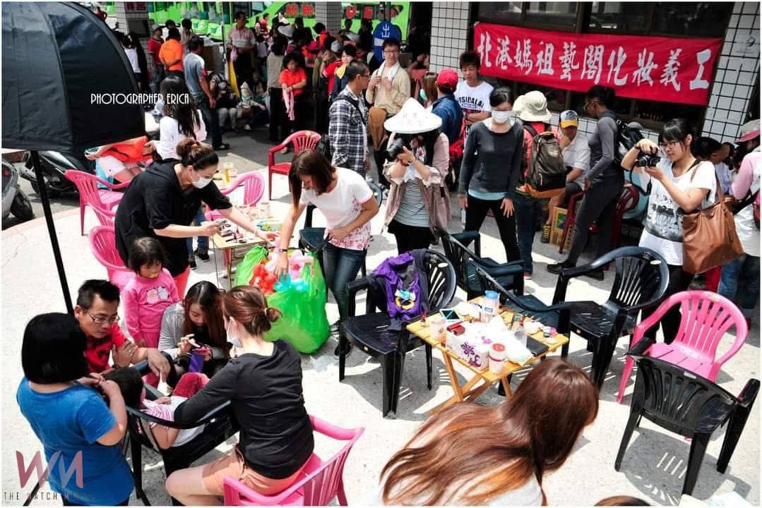 二十多年來堅持在藝閣期間,免費為參與的小朋友化妝。完美100專業美容師蔡紫彤指出,和妹妹蔡佳汝當時都是從是美容化粧行業,想北港迎媽祖,大家都為媽祖做事、服務,也可以利用自己的專業為大家做些什麼,於是一開始是妹妹帶著化粧箱主動詢問加入個人團隊,幫小朋友化粧,到後來在藝閣停車場定點協助化粧,到現在,每年有10至20志工加入,每年這時候完美100店休5日,我們使用有品牌的化粧品,志工們利用專業與巧手,讓每位小朋友都能以最亮麗的面貌登上藝閣,體驗傳統文化的榮耀,同時也為部份隔代教養或家中經濟困難的家庭減輕負擔。