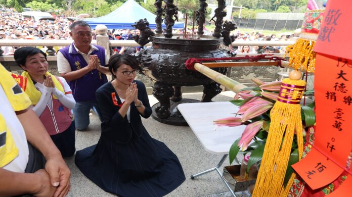 ▲縣長許淑華特前往參拜,恭迎媽祖聖駕,跪地祈求南投平順,為南投帶來興盛。(記者石振賢翻攝)