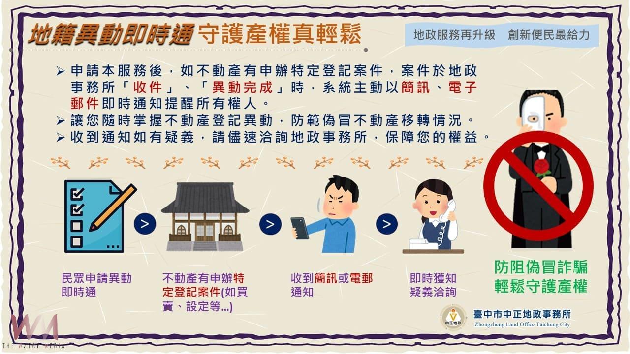 台中市中正地政事務所表示,身為「地政台中打詐隊」成員及第一線為民服務的機關,呼籲民眾須提高警覺。地政局表示,不動產價值高,易成為有心人士的鎖定目標,為避免落入詐騙話術陷阱,建議民眾申請「地籍異動即時通」服務,在不動產申請買賣、贈與、調解移轉或設定抵押權登記等異動時,所有權人能即時收到簡訊或電子郵件通知,如確認非本人申請案件時,可及時向地政事務所提出異議,立即阻斷詐騙偽冒行為,守護民眾不動產權利。