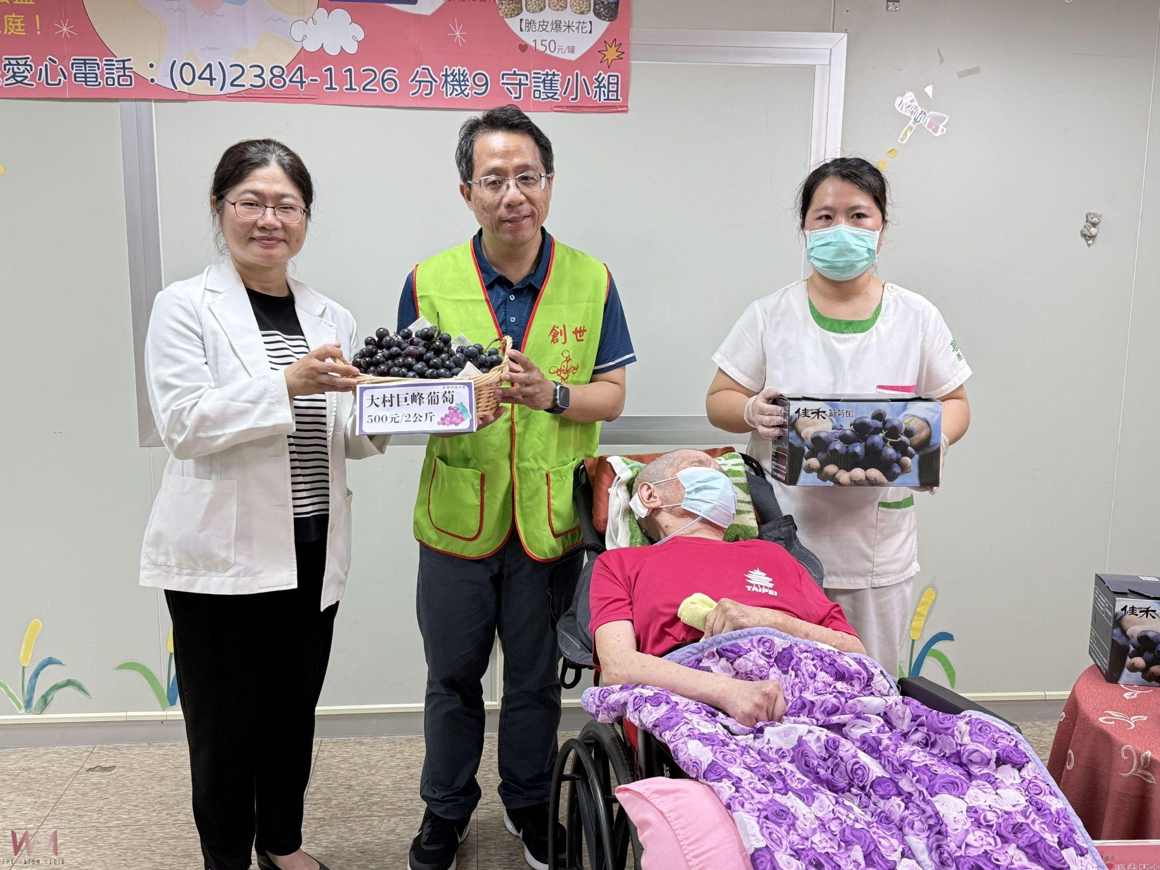 (觀傳媒中彰投新聞)【記者廖妙茜/台中報導】「現榨葡萄汁,葡滿愛與希望!」彰化縣大村鄉以生產巨峰葡萄聞名全台,飽滿多汁的巨峰葡萄,色澤深紫果粒圓潤,深具營養價值。創世台中院為推廣大村葡萄義賣,特別邀請營養師廖秀玲來院現榨葡萄汁,由創世護理師透過鼻胃管灌食給植物人食用。呼籲民眾愛心支持葡萄義賣,除守護自己及家人的健康外,所得助植物人營養餐食,兼具愛與健康的意義。