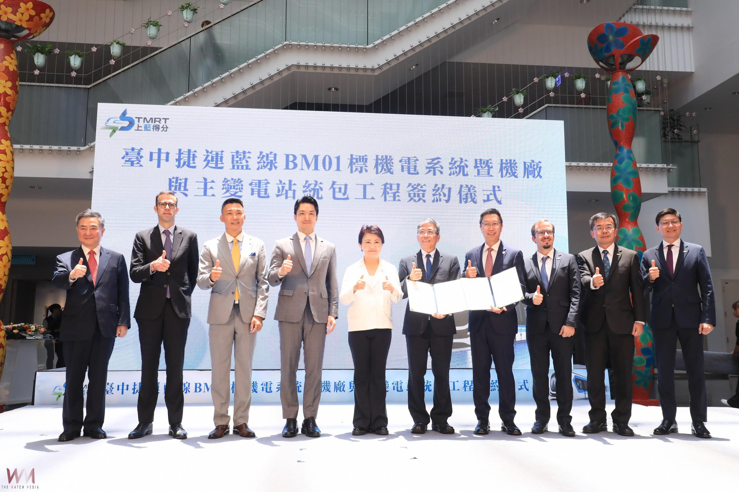 今日簽約儀式在市府台灣大道市政大樓舉行,由台中市府捷運工程局長蘇瑞文與新加坡科技電子有限公司總裁趙文良、阿爾斯通運輸股份有限公司東亞地區務董事 MR. Toby Tiberghien、中鼎工程股份有限公司總經理李銘賢、現代樂鐵股份有限公司資深副總裁金正勳進行簽約。由於此次機電標工程由法國、韓國、新加坡及我國共同合作打造,因此也特別邀請新加坡駐台北商務辦事處代表葉偉傑、法國在台協會主任龍燁(Franck Paris)、駐台北韓國代表部代表李殷鎬到場一同見證。