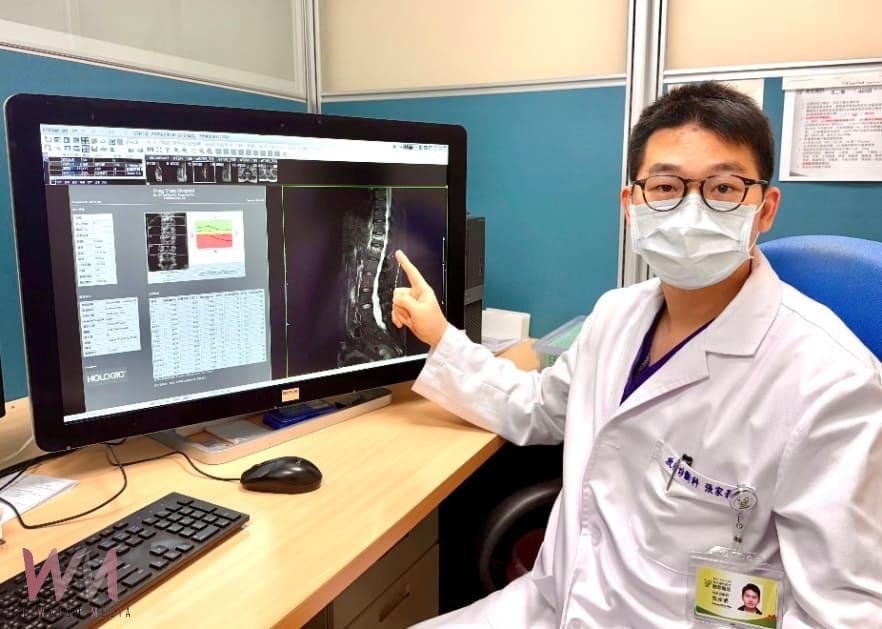 放射診斷科主任張家豪醫師,指出患者胸椎第12節及腰椎第1節壓迫性骨折病灶圖。(圖/記者廖妙茜翻攝)
