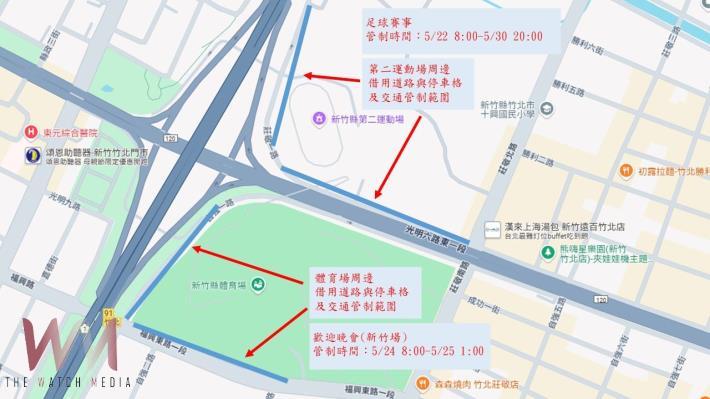 足球賽事期間管制範圍則為莊敬北路、光明六路東一段慢車道至莊敬一街、收費停車格(編號50至88號)。管制時間自22日早上8時至30日晚間10時;接駁車營運時間為25日至27日及29日至30日,其中臺鐵竹北站發車時段為早上7時30分至晚間6時50分,高鐵新竹站發車時段為早上7時20分至晚間7時20分)。