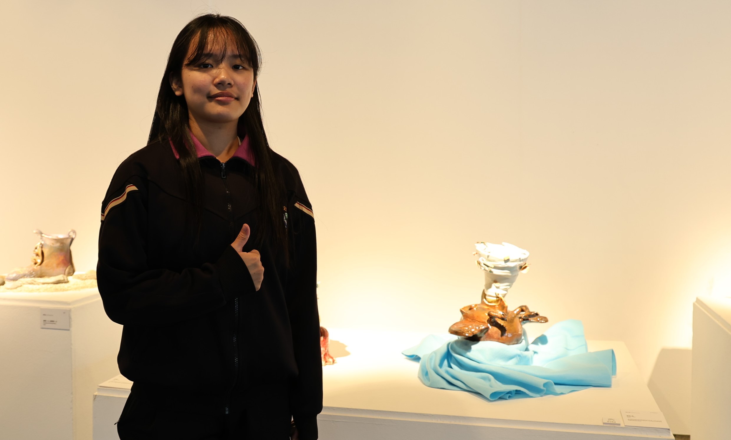 全臺唯一設有陶瓷工程科的新北市鶯歌高級工商職業學校,首創師徒制並執行多年,邀請陶藝師傅以傳統師徒制的方式任教,每年在學生畢業前舉辦成果展。今年由6位師傅以及79位同學努力學習的成果,不論是釉藥、陶塑、彩繪、茶壺或拉坯等技法,充分融合匠師的技藝與學生的獨特個性。《戰敗.鴞》由喜愛鳥類的張芷綺創作,她發現灰林鴞被颱風影響導致鳥窩被破壞,便天馬行空的創作灰林鴞吃掉巨風,生動表現消滅威脅生存的因素。《掙扎》是對中藥材及占卜有興趣的王昱閔,有感於人類因迷信等原因,過度捕撈物種引發瀕臨滅絕的情況,透過龜足進化長出強力爪扎脫捕捉網的想像,引領觀眾反思。喜歡傳統古物的吳承翰,創作器物《鼎》,反覆飾釉讓作品呈現歷史與古樸的樣貌,以文化觀點提出環保保存的探討,別有新意。