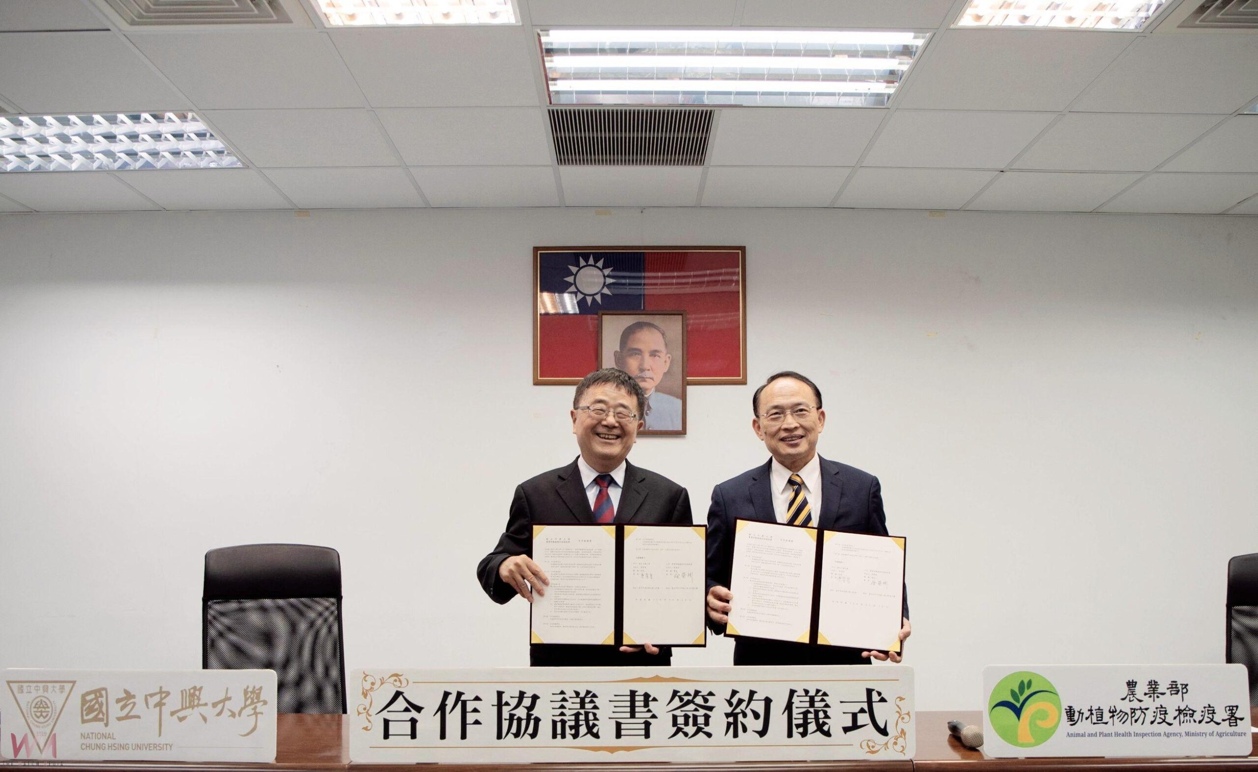中興大學詹富智校長(左)與防檢署徐榮彬署長(右)代表簽署合作協議。(圖/記者廖妙茜翻攝)