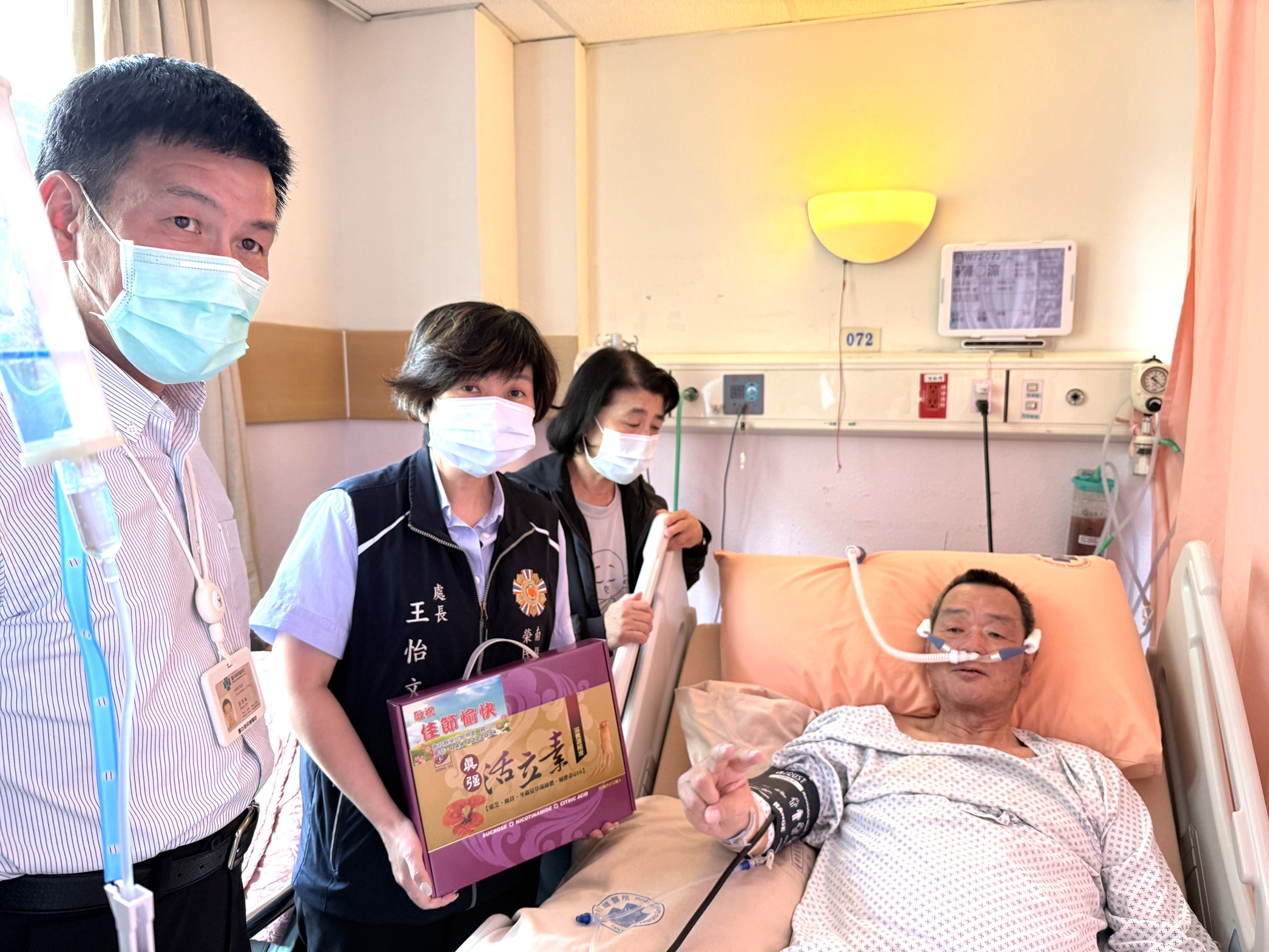 王怡文處長率同仁先後前往臺中榮民總醫院及臺中榮總埔里分院探視住院榮民,親自致贈營養品禮盒,代表輔導會主任委員嚴德發先生送上平安祝福,鼓勵長輩們耐心接受治療,早日康復返家團圓。住院榮民們見到處長專程探視,皆感歡喜與感動,現場洋溢著濃厚的節慶氣氛與溫馨氛圍。訪視期間,王處長亦特別拜訪臺中榮總及埔里分院社工室主任,感謝醫護團隊用心照護,確保榮民們獲得妥善醫療與關懷。