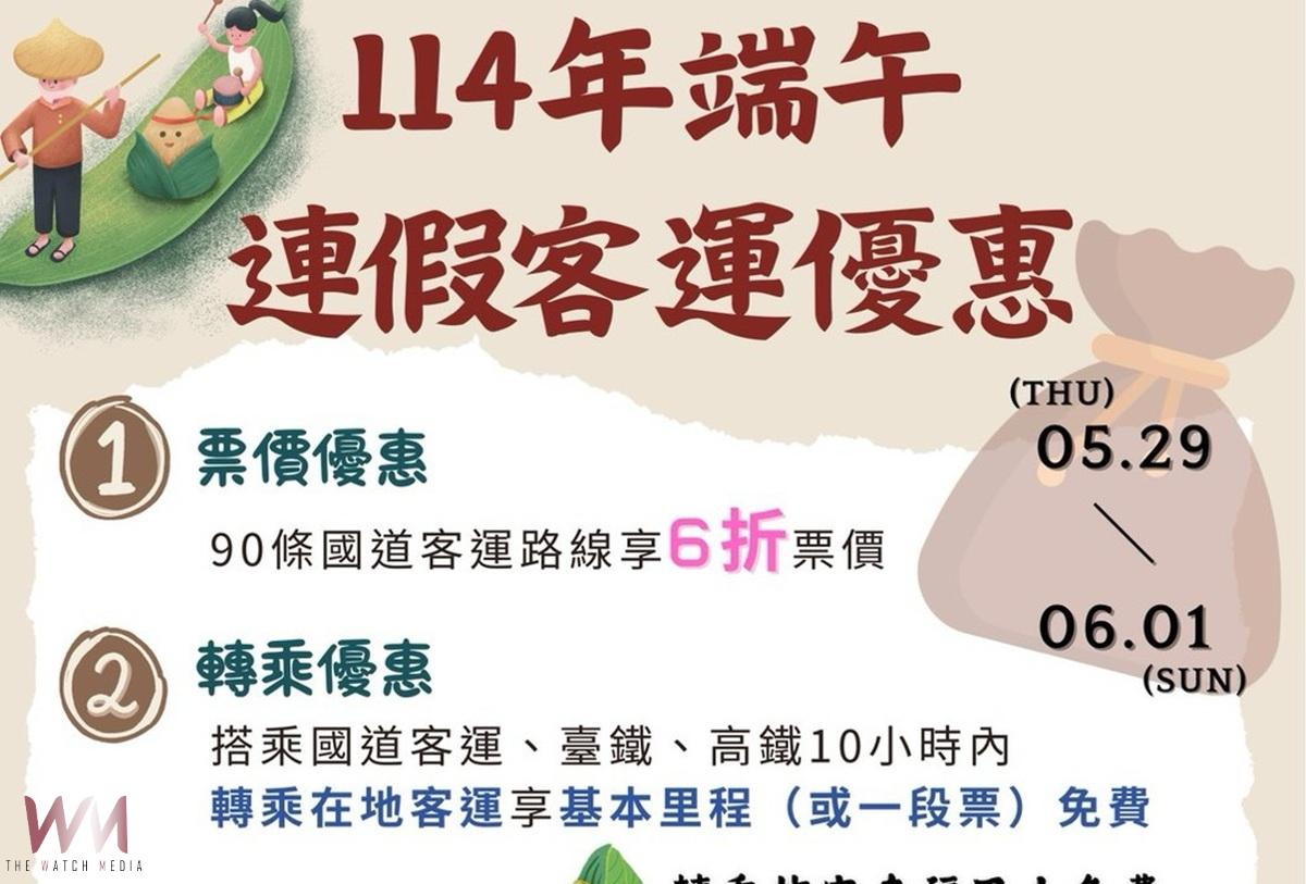 (觀傳媒雲嘉南新聞)【記者洪佳伶/雲林報導】端午連假即將到來,公路局為鼓勵民眾於連續假期期間多加使用公共運輸,減輕道路壅塞壓力,特別提供各項超值疏運優惠。此次優惠期間自114年5月29日(週四)0時至6月1日(週日)24時止,提供多項國道客運與轉乘優惠,以及東部地區專屬優惠,讓民眾出遊、返鄉更加便利又省荷包。