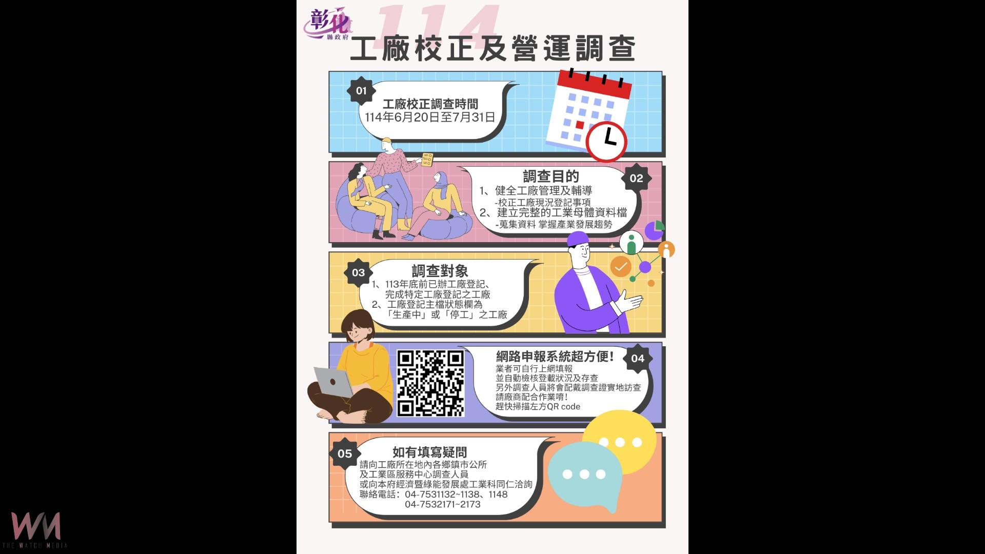 (觀傳媒彰化新聞)【記者陳雅芳/彰化報導】經濟部年度工廠校正暨營運調查即將於6月20日展開,調查對象為113年底前依《工廠管理輔導法》完成工廠登記或特定工廠登記的業者。彰化縣須參與本次調查的工廠數高達13,030家,為全國第三多。調查將持續至7月31日,彰化縣政府呼籲相關業者配合填報,以利產業政策精準規劃及資源分配。