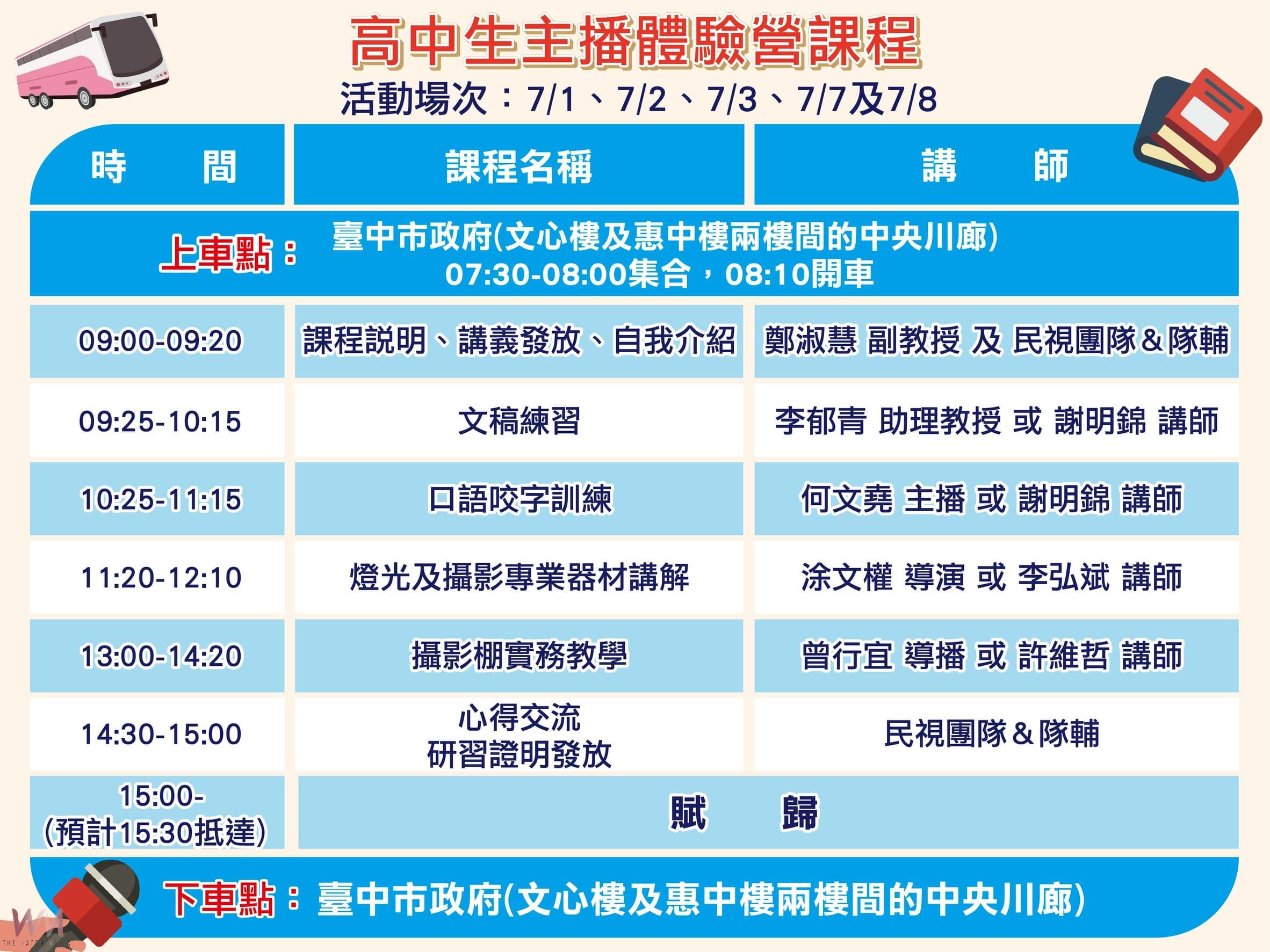 新聞局補充說明,活動為單日密集型課程,全程免費,每梯次限額35人,共辦理5梯次。課程將安排於朝陽科技大學的專業教室與攝影棚進行,並提供市府至上課地點的接駁服務,協助學生順利到場。