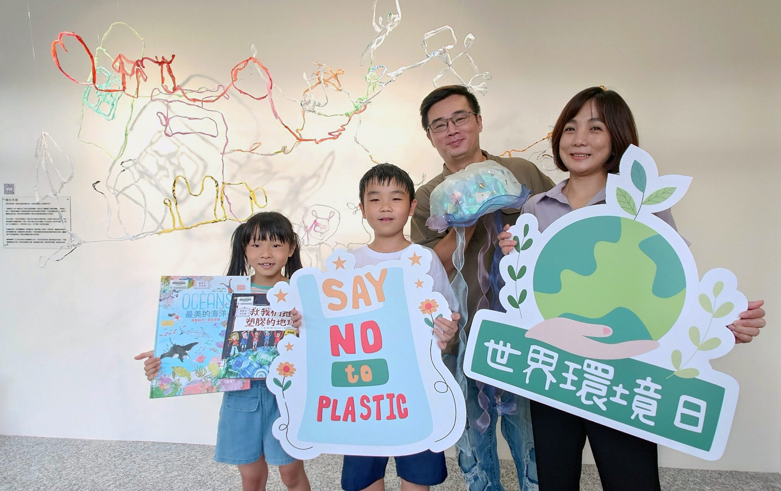 (觀傳媒新北新聞)【記者蔡宇辰/新北報導】響應6月5日世界環境日與6月8日世界海洋日,新北市立圖書館八里龍形圖書閱覽室特別邀集社區親子,帶著家中廢棄的塑膠袋或雨衣,一起到圖書館與藝術家共同創作「垃圾藝術品」,希望提醒民眾改變生活,降低日常生活垃圾的使用量,共同為保護環境盡一份心力。