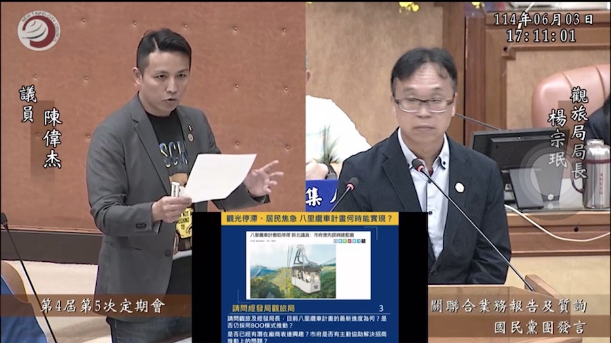 此外,陳偉杰亦針對八里纜車計畫提出質詢,指出該計畫已討論多年,卻遲遲未見具體進展。八里地區自八仙樂園事件後,觀光發展陷入停滯,居民期盼纜車計畫能為地方帶來新氣象。然而,多年來市府雖曾表示有兩到三家廠商表達接洽意願,但進度始終停滯不前。要求經發局與觀旅局長清楚說明八里纜車計畫目前進度、是否仍採BOO模式推動、是否已有廠商明確表達投資意願,以及市府是否積極協助解決招商推動問題,並提出明確的時程與藍圖,讓居民不再失望等待。