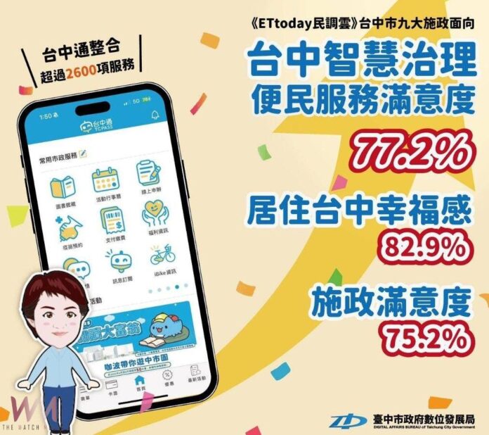 (觀傳媒中彰投新聞)【記者廖妙茜/台中報導】台中市長盧秀燕積極打造台中幸福宜居城!根據《ETtoday民調雲》近期公布最新調查,台中市在九大施政面向平均滿意度達76.2%,深受市民認同肯定。當中台中在「智慧治理與便民服務」政策滿意度達77.2%,包括創設全台縣市政府唯一的數位發展局,以及打造數位平台《台中通》,整合市府2600多項線上服務,都是盧秀燕的創舉,不僅簡化行政流程、提升治理效能,更落實環保永續,全面展現推動智慧台中,切合AI科技發展的世界潮流。