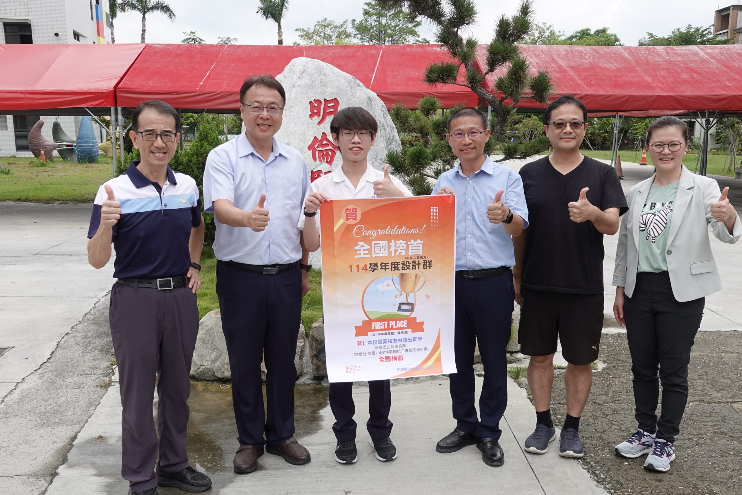 彰化高商校長陳定宏今(6)日陪同林澤宏返回母校明倫國中貼榜,並贈送「全國榜首」紅布條,感謝國中端的用心栽培,也見證兩校攜手培育出全國第一的設計人才。陳定宏表示,林澤宏自高一入學以來便展現強烈企圖心與自律精神,不僅課業表現優異,專業能力更屢獲設計競賽肯定,如在全國美術比賽中榮獲書法類美術班組優等,實力與潛力兼具。