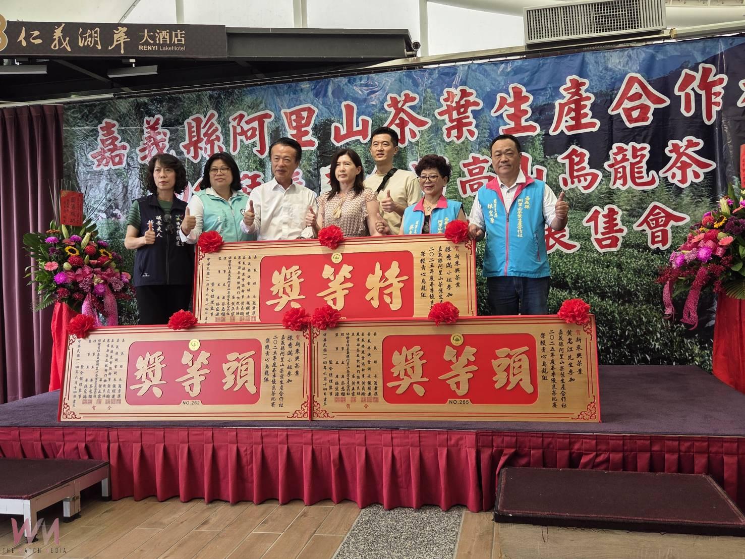 (觀傳媒雲嘉南新聞)【記者邱嘉琪/嘉義報導】阿里山茶葉生產合作社14日在仁義湖岸大酒店舉行春季優良茶頒獎典禮,由嘉義縣長翁章梁、立委王美惠、合作社理事主席蔡惠櫻及議長夫人黃瓊賢等人頒獎表揚。新東興茶業陳秀滿勇奪烏龍組特等獎,櫻之駅莊春美則拿下新品種組特等獎。