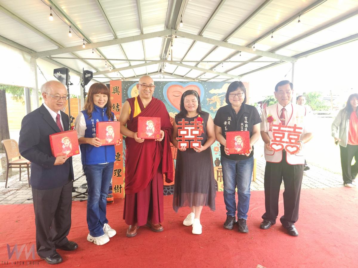 最特別的是,來自西藏哲蚌寺的昂望嘉措格西也親臨現場,為新人披上哈達,獻上平安與祝福。婚宴現場滿桌喜氣洋洋的日興堂喜餅,以及由世唯提供的三層結婚蛋糕,象徵家庭在責任、義務與情感的層層堆疊中更加堅固。現場賓客還一同搓紅湯圓,象徵圓滿幸福,為兩對佳偶獻上最誠摯的祝福。